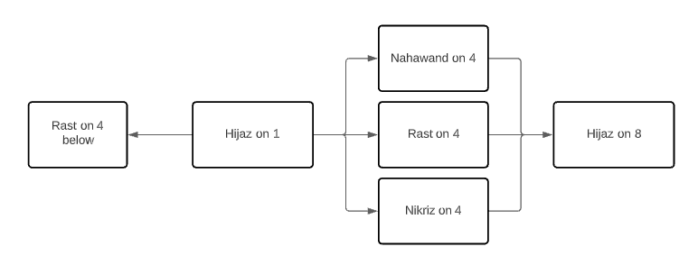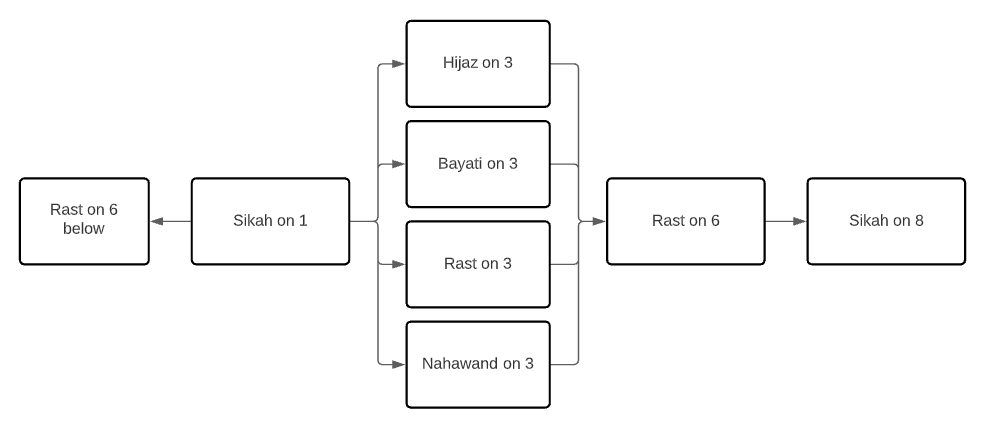 To gain familiarity with the sound of the different ajnas and maqamat, I recommend playing around with them, and slowly broadening your spectrum. For each maqam family I have made an example path to follow during your explorations of the different colours of the maqam. It is highly recommended to set a drone to the root of the maqam you want to practice, so you can always relate the different intervals of the notes to the root of the mode.