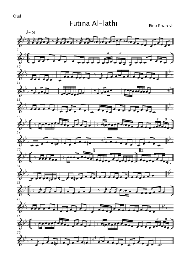 The song Futina Al-Lathi by Rima Khcheich displays another form of modulation. The tonic of the piece never changes; it is always a C. Nonetheless there are quite some back-and-forth modulations going on, namely between rast and nahawand. Also there are some occasions in which the composer ‘borrowed’ some notes outside of the jins to either create a stronger motion in a certain direction, or to ornament a certain note that is important to the melody at that point.
