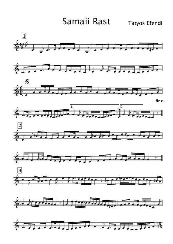 In this piece we see some modulations of another kind. This is a Samaii, a common song form, which I will describe in further detail in the chapter Song Forms. The numbers 1, 2, 3, and 4 above respectively bars 1, 10, 14 and 22 are used to indicate different verses of the song. Bars 5 to 8 (and bar 9 after the repeat) form a sort of chorus, which is repeated in between verses. The first verse has the function of exhibiting the maqam, which is rast. It stays within the realms of the primary jins of rast. The chorus is also still within the same tonal material, so no modulations there.