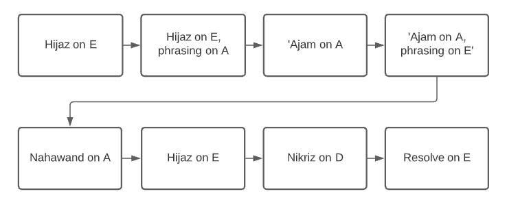 In the piece Hijaz Mandira there are several modulations happening. The first 14 bars revolve around the base jins of hijaz on E. Not many notes outside of this jins are used. The difference between bars 1-6 and 7-12 is that in the first 6 bars the melody lands on E, and in the next set of bars the melody lands on A, which is the ghammaz of the jins. Then in bar 14 it lands on E again to resolve that part of the melody. Then from bar 15 phrases are formed from the ghammaz A. Here ‘Ajam is played, first around the A, then around the high (octave) E. From bar 29, the melody borrows notes from jins nahawand to create a stronger downward motion back to the A, and ultimately back to the root of the primary jins hijaz on E. From bar 34 the music starts hinting towards jins nikriz by starting phrases on the D below the root note E. In bar 39 the melody lands on this note, and from here it can be seen as a modulation to jins nikriz. At the end the piece ends by going back to the tonic E. Although the note material stays the same within most of the song (sometimes C# is exchanged by C), the piece shows some characteristics of modulation and melodic development. This results in a nice journey through different jins all related to maqam hijaz. The journey can also be shown in a flow chart like this: