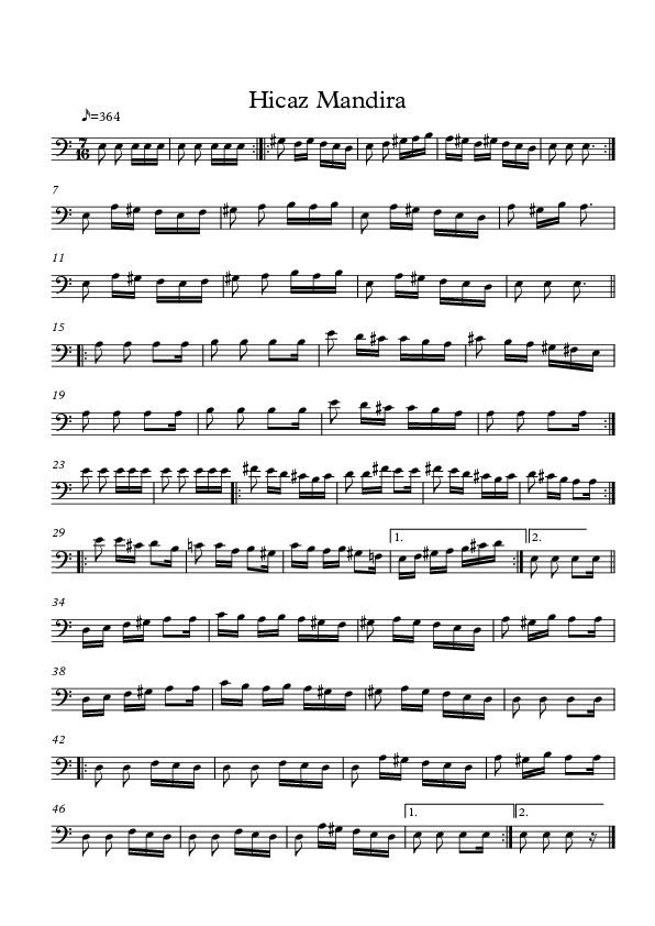 An example of the first phenomenon is in bar 40, where the Bb is used rather than B to create a stronger motion towards the A and further down. We have seen this in the chapter on maqam rast as being very common to use jins nahawand to create a stronger downward movement.