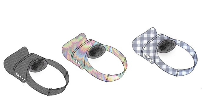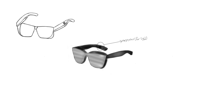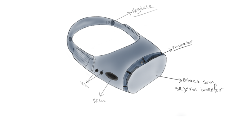 steg 2 - Her valgte lagde vi forskjellige skisser til VR-brillene, hvor fokus var på materiale. Vi ønsket at brillene skulle være myke, og bestemte oss derfor for at de skulle kunne dekkes me stoff. Vi lagde og et par skisser til hvordan det grafisk grensesnitte kunne se ut.