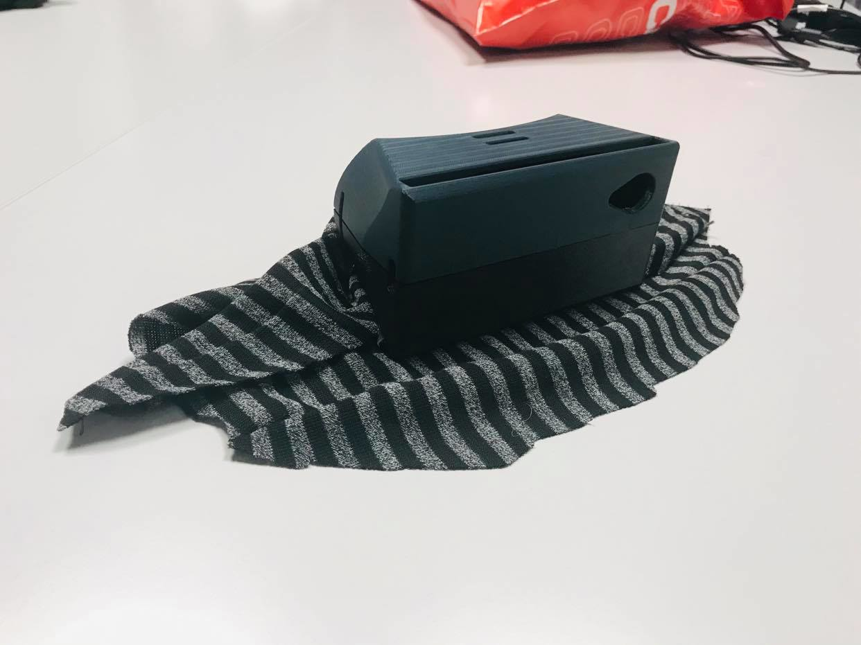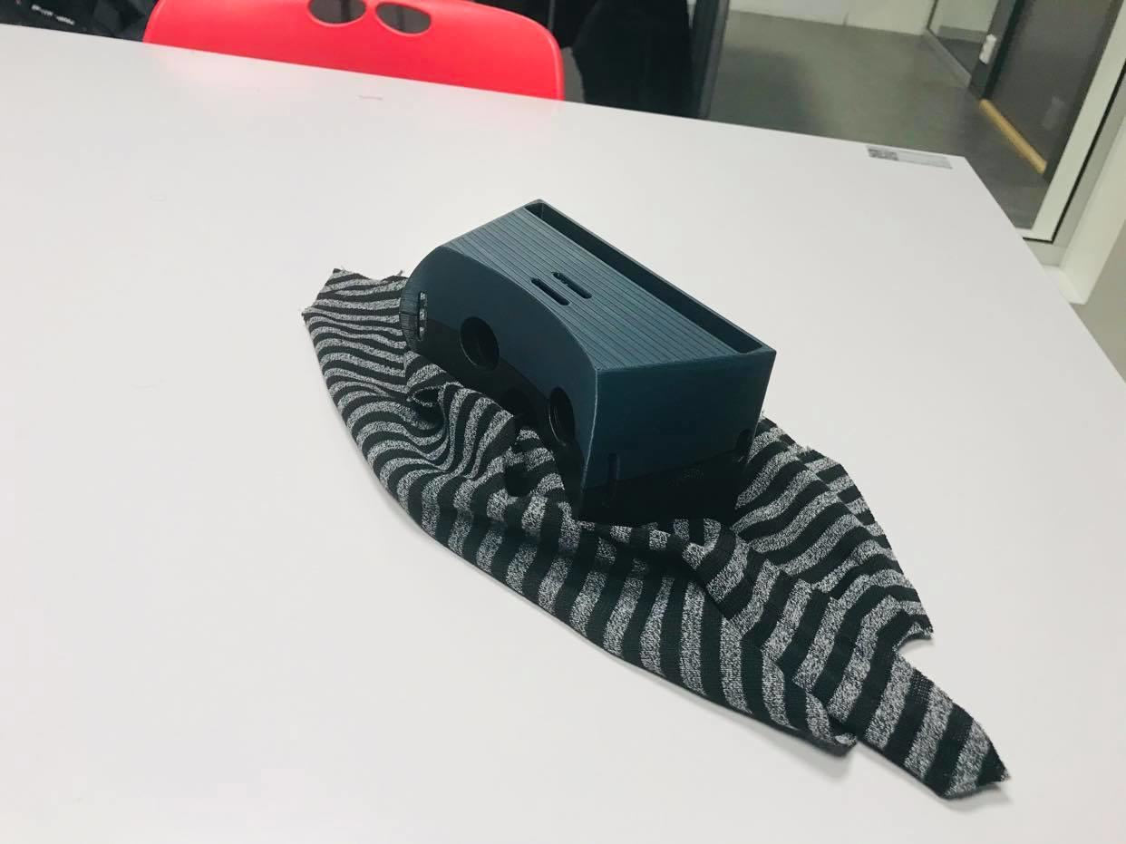 Steg 3- Her satte vi sammen de ulike formene og bestemte den endelige formen som VR-brillene skulle ha. Dette er som er vist på bildene nedenfor. Produktet dekkes av stoff og dette gjør at VR-brillene passer for flere ulike brukergrupper. Produktet kan også komme i ulike størresler som passer for alle brukere. Her gjorde vi også ferdig det grafiske grenssnittet.