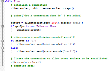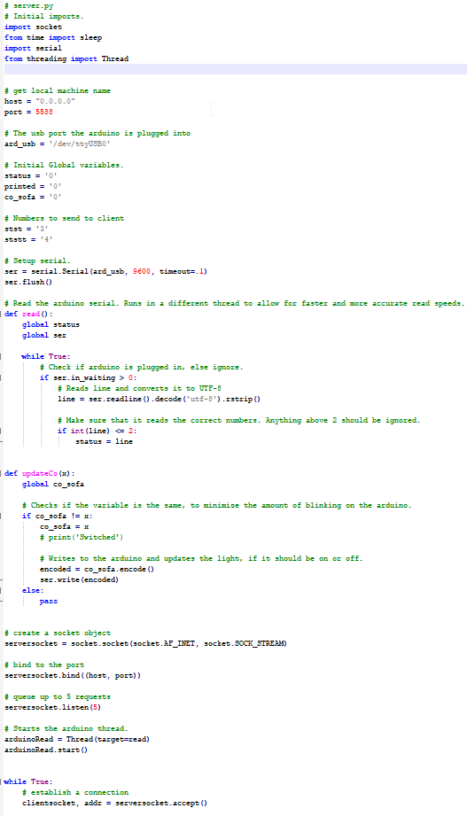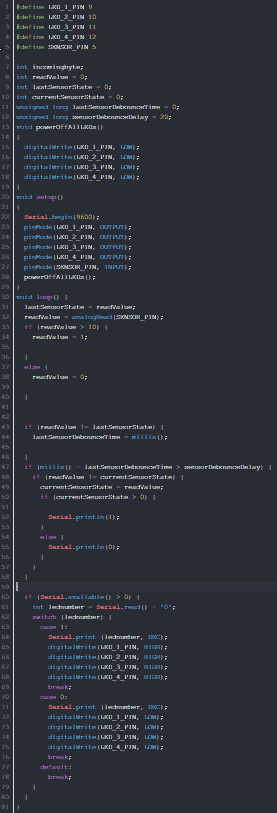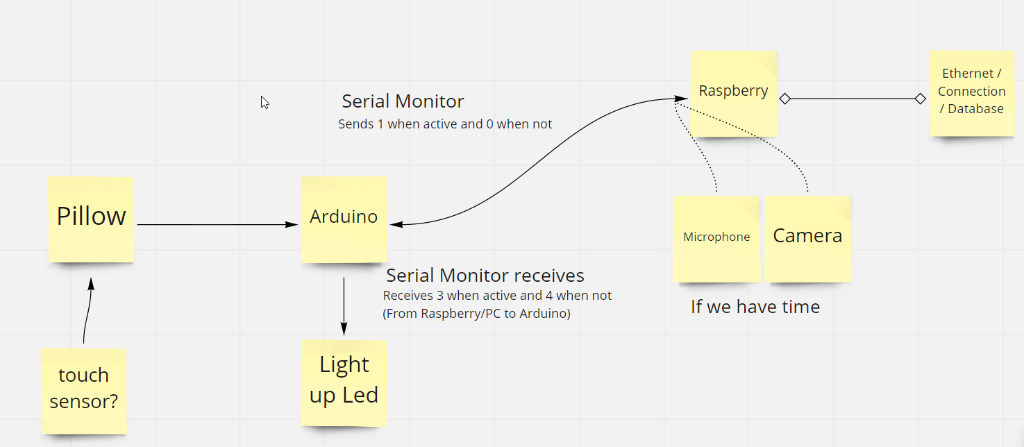 the arduino code works as follows: Depending on if the sensor inside the pillow is activated or not, the arduino sends a different number to the rasberry pi. And if the ardiono recives a spesified number it means that somone is using the other pilllow and the light innside shoud turn on and if it recives a nother number the lights shoud remain off.