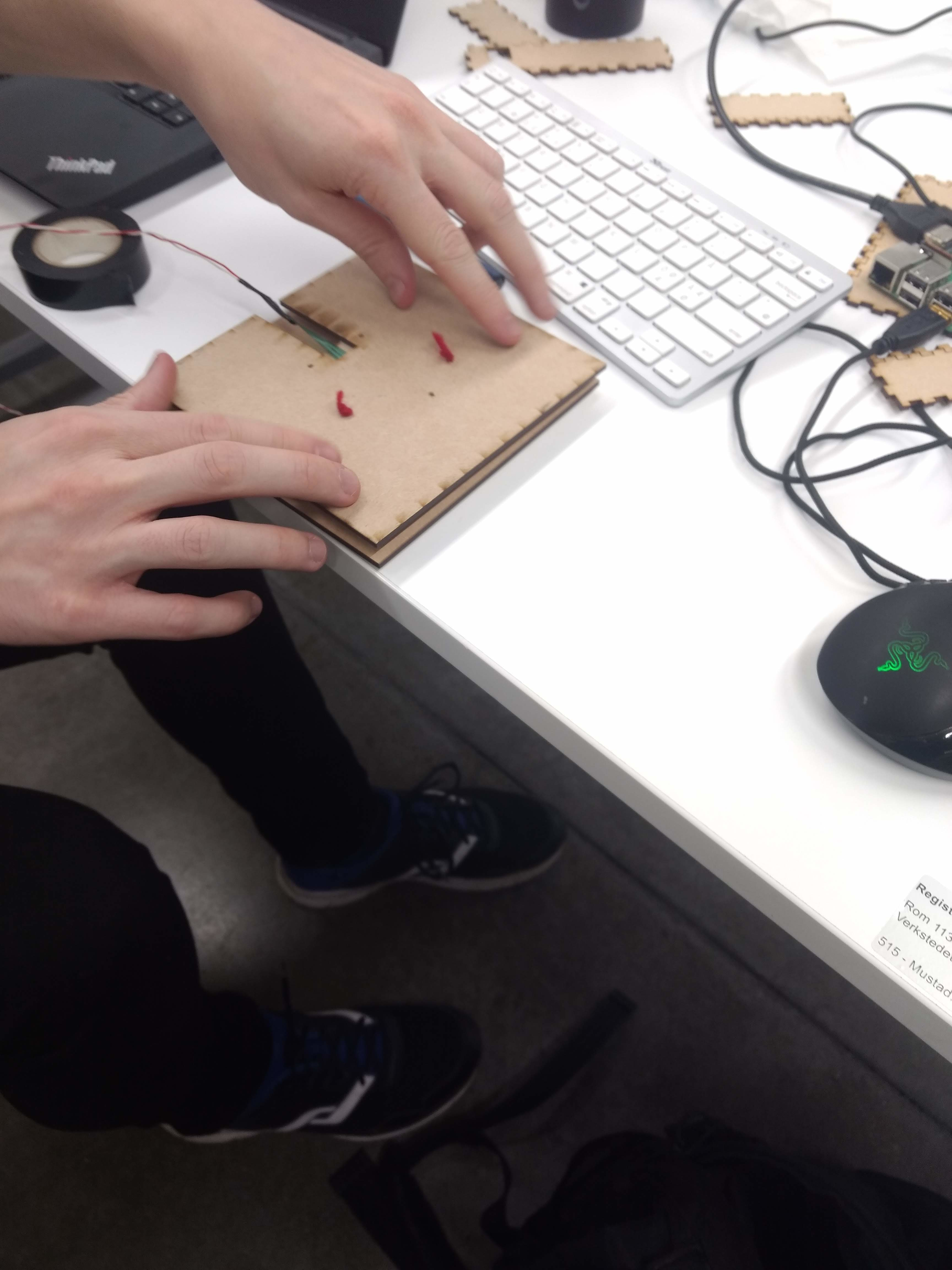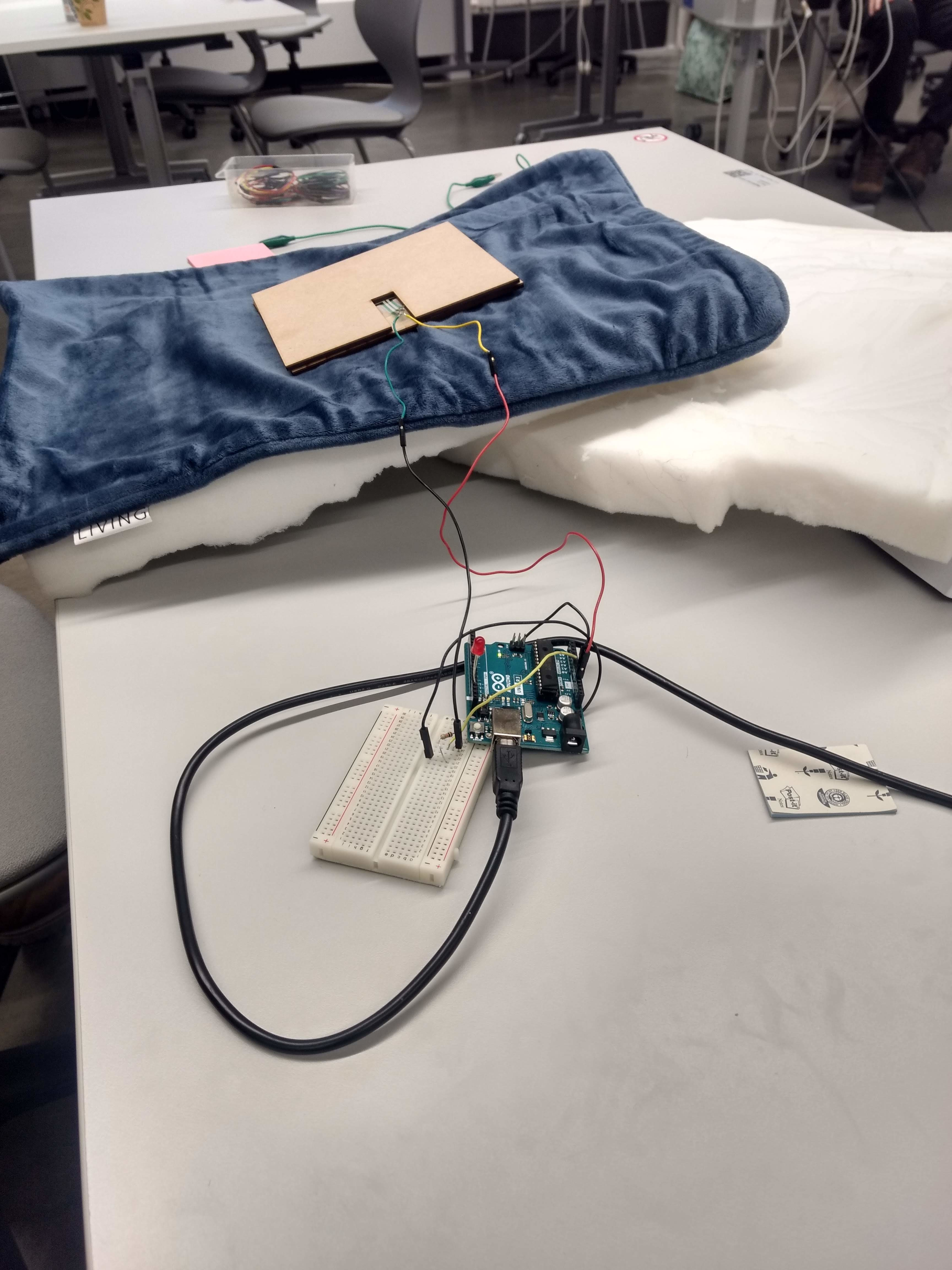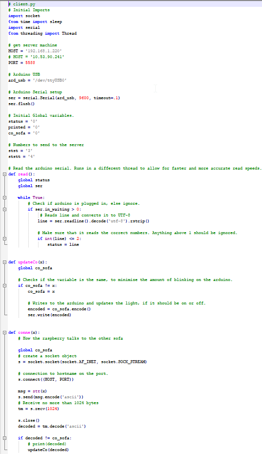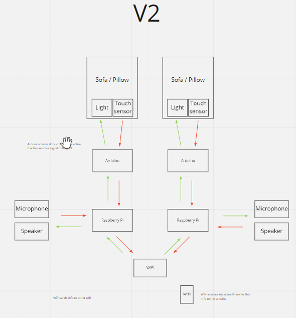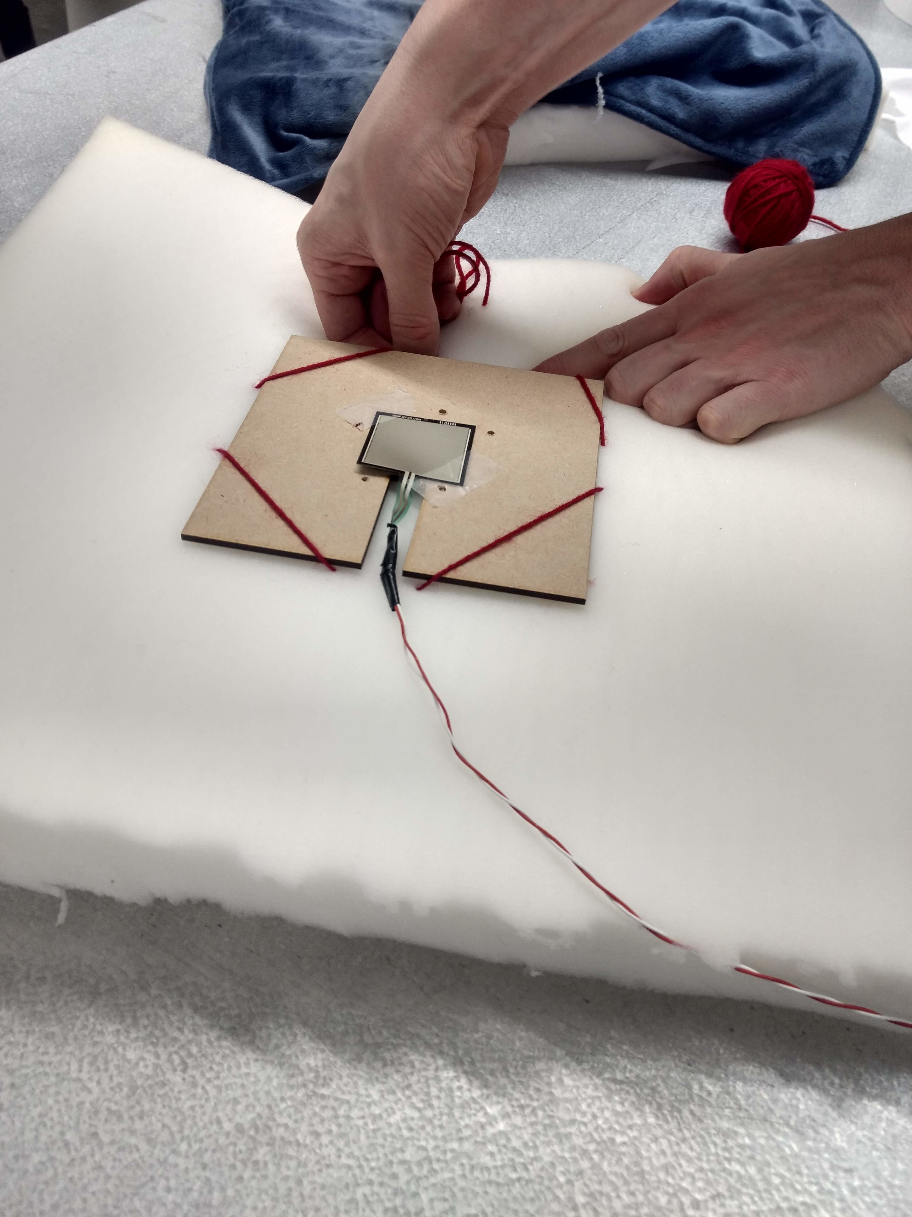 Making and prototyping the final prototype: The last step was to actually make the prototype itself. For that we used two pillows. We used an Arduino to controll both the light and the sensor in each pillow in order to make it so that when a person is sitting on or holding one pillow the other lights up/glows. The code for the arduino in this project is relativly simple: We have used Arduino seriall communication to send information between the Arduino and the Rassberry Pi. (Rassberry Pi code:https://github.com/Burning-Panda/Interactive-Remote-Touch-Sensor)We are using Server / Client setup because we are running on a local network.One raspberry is running the server.py and the other is running client.py. Optimally we would need another machine to handle the server, and both raspberrys would be clients, but that's a task for another time. Seriall communication is used to make the two Arduino communicate with the Rasberry Pie.