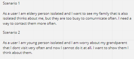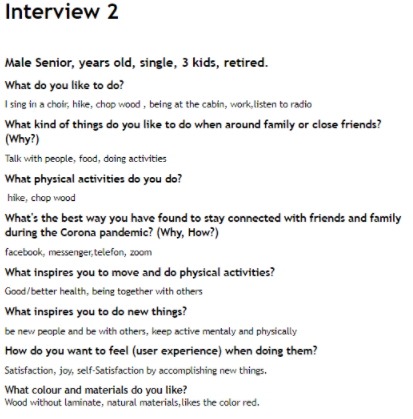 User Reaserch: The first thing we did in this project, was to conduct a bitt of user reaserch. We did this in the form of conducting 3 interwievs with potential users. This helped by gaving us some ideas about what they liked to do, and tought about social isolation, and how they delt with it currently during the pandemic.