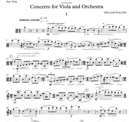 Examples 1 and 2. Frederick Riddle playing Viola Concerto by William Walton, 1st movement, bars 1-23.