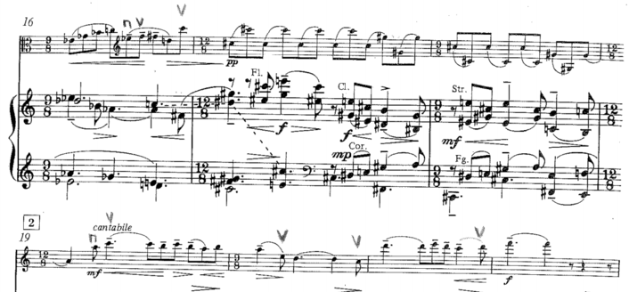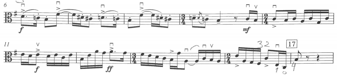6. Opening (bars 8-21): original bowings of the solo viola part |