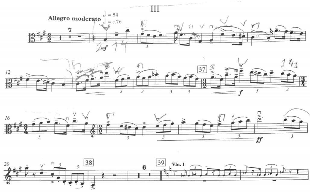 We find quite a few differences in this category, due to Primrose added personal details to the piece, probably to enhance his tendency towards virtuosity. He plays some excerpts of the second movement an octave higher, to avoid “unseemly scrubbing on the lower string3”. Perhaps it was also an attempt to look more like a violin than a viola, which was quite common at that time.