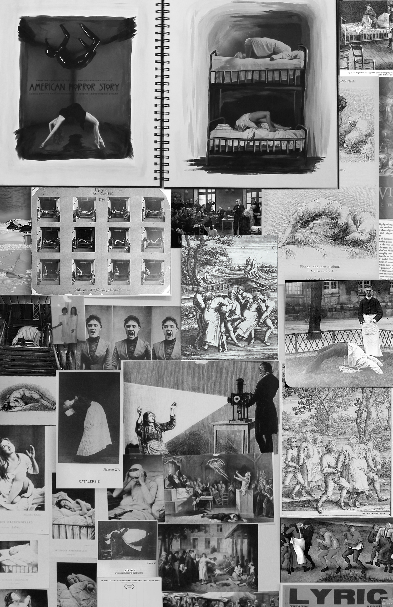 This draft will be further developed into an interactive media landscape with inserted media clippings of “contagious mass hysteria” in public discussions; videos of such presumed instances; it will contain moving images, sound and links to exhibitions, publications and other resources that have looked into hysteria within the arts and it will incorporate drawings/paintings/sketches from my own notebook archive and close ups from my image atlases that reflect on these themes. Therefore, this exposition will bring together and visualize this “hysterical discourse” of "artistic contagion" and its involvement, entanglement and affectedness with these current discussions around contagion, not only from a theoretical standpoint but also from an aesthetical, artistic, affected one.