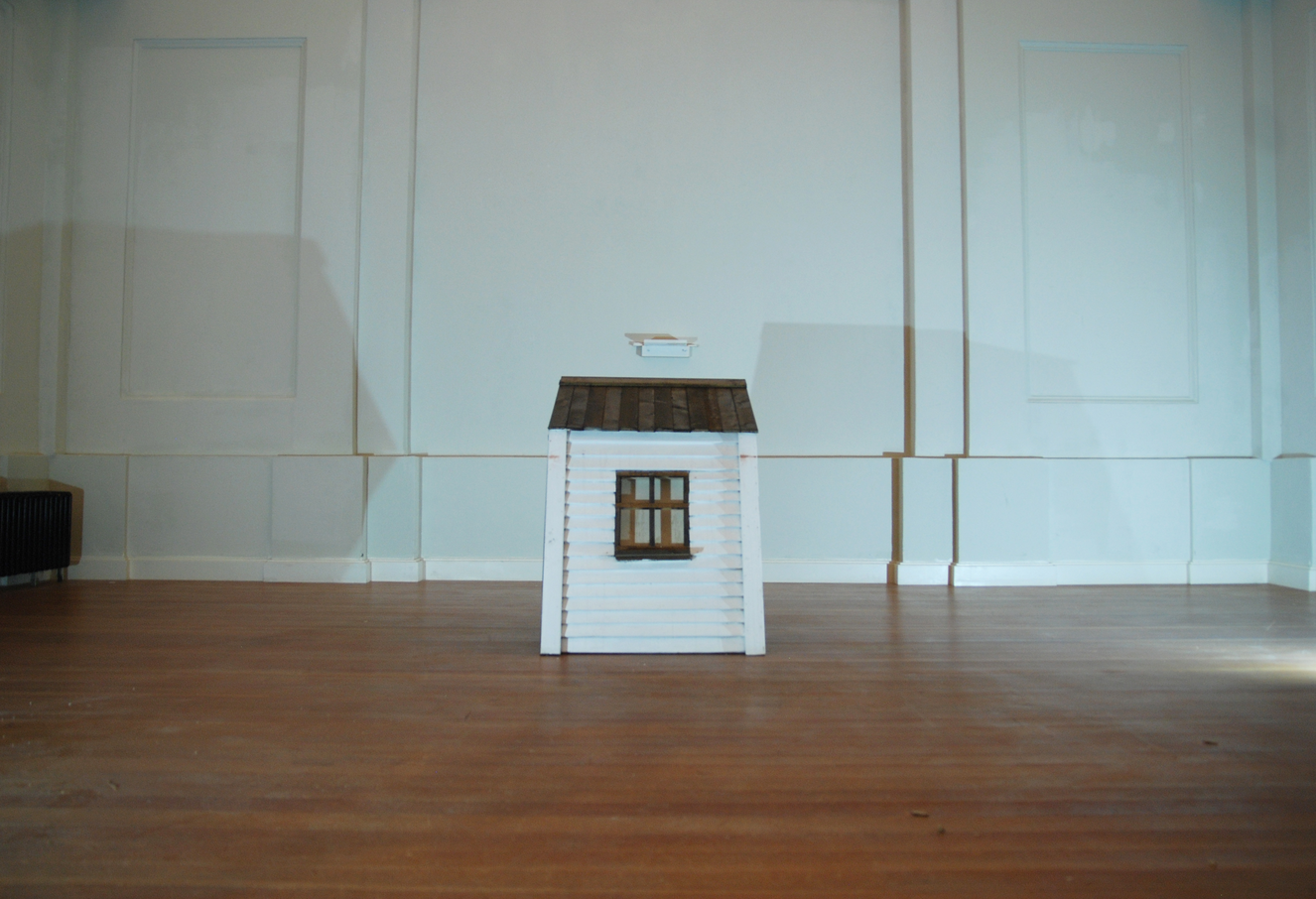In This Wall Was Painted For the Strangers Who Observe it With a Glance in the Moment of Passing, the house is portrayed by a canal in a forest and in a white gallery space. The shots of the video alternate between the house shown at a distance and close images of the crackling paint and dirt on its walls. A composition was written for the video to be played on alto saxophone. The composition follows the alternating shots of the video by alternating in pace and pitch, reaching a sort of crescendo as the house is shown in the gallery space.