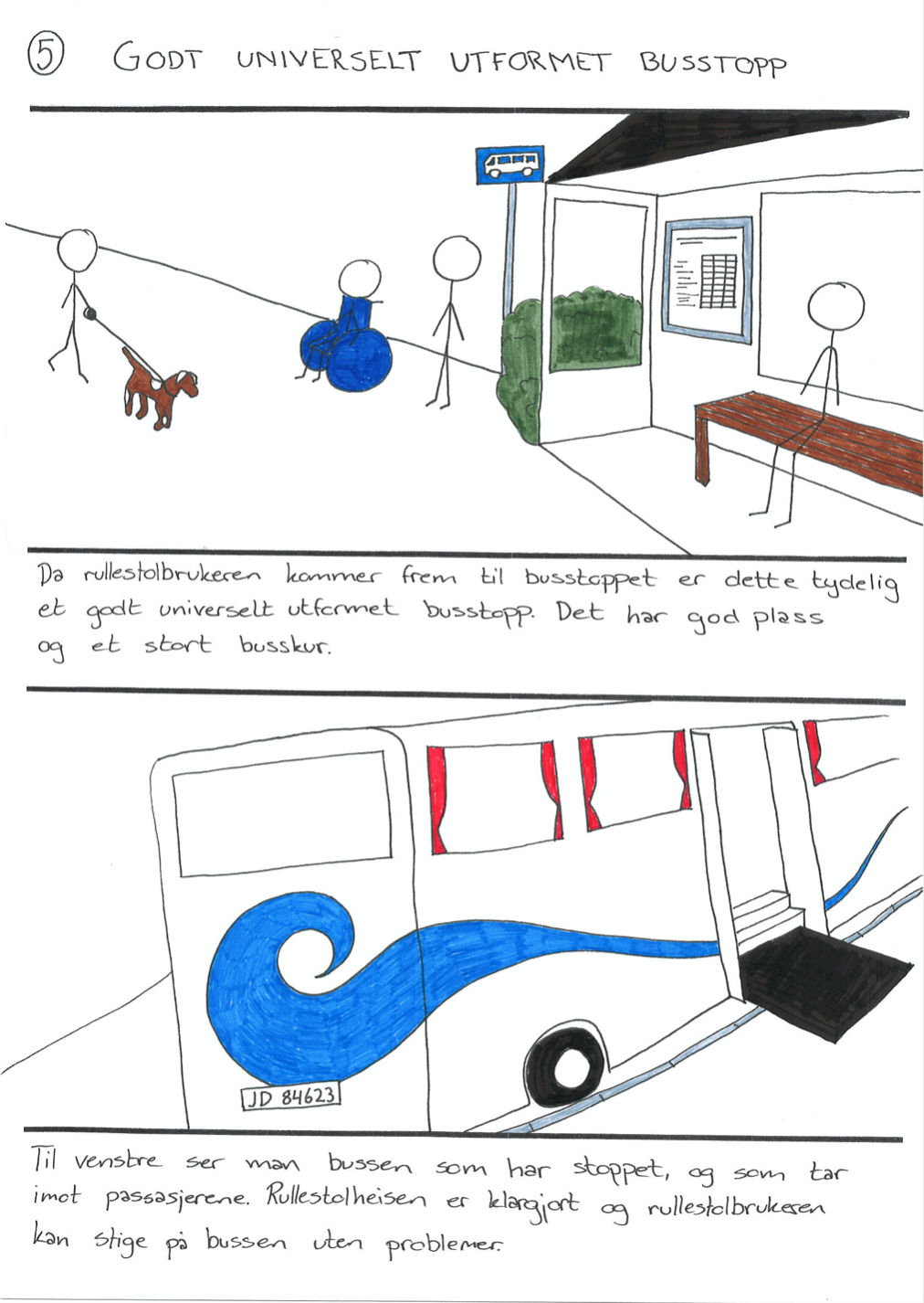 Prosjektet startet med konsept-arbeid og diskutering i gruppa. Da konseptene var ferdig, planla vi prototypen. Først planla vi historieforløpet til videoen, for så å finne ut den beste måten å legge opp historien med tanke på de ulike universelle utformingene som skulle legges frem. Så ble storyboardet planlagt gjennom enkle skisser. Til slutt ble prototypen tegnet og forklart. Alt dette kan sees under.