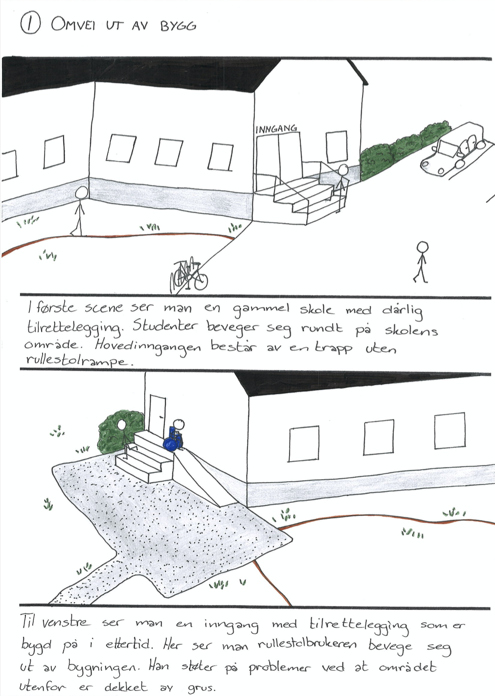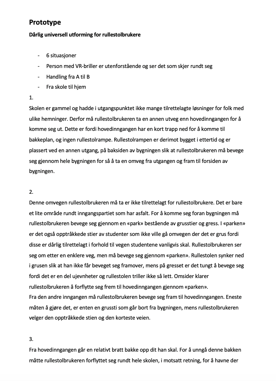 Prosjektet med tittel Prototype – VR-video, har som mål å gi et inntrykk til studenter om hva som er godt universelt utformet, og hva som ikke fungerer i hverdagen til folk med ulike hemninger. Dette vises gjennom bruk av VR-briller og video som formidler et følelsesrettet budskap. Dette er for å hjelpe studenter med å forstå vanskeligheter ved dårlig universell utforming. Vi var fire personer fra Velferdsteknologi på tvers av fag, som jobbet sammen om prosjektet. Prototypen består av et storyboard som gir ett inntrykk av hvordan videoen ville utartet seg. Vi valgte å gjøre det på denne måten på grunn av vanskeligheter som kom av ulike timeplaner og liten mulighet for møter og samarbeid. Det hadde vært en mulighet å laget en video som prototype, men tiden strakk ikke til denne gangen.