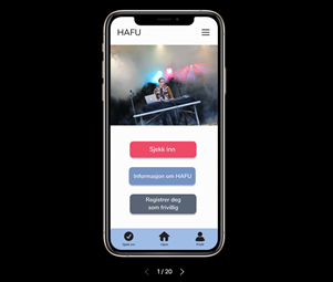 Vi har laget en klikkbar prototype for en app for elektronisk registreringssystem for ungdomsklubben “HAFU” i Hunndalen, som både har funksjoner for ungdommer, frivillige og adminer/de som styrer klubben. Den består primært i at ungdommen registrerer seg i et skjema når de skal inn og ut av huset, og at admin kan logge seg inn i appen og se en oversikt over hvilke ungdom som er tilstede. Første gang du bruker HAFU-appen blir du bedt om å lage/registrere en HAFU-bruker med fullt navn, passord, fødselsdato, telefonnummer og epost, og evt. bilde og beskrivelse av deg selv om man ønsker (alt dette utenom navn kan endres i etterkant). HAFU-brukeren vil ha ulike funksjoner basert på om man er en besøkende/ungdom eller en admin. I appen kan man som gjest, altså uten å logge inn, lese generelt om HAFU, som f.eks. om opprinnelse og hjelperollen, eller søke om frivillig hjelperolle med fullt navn, telefonnummer, epost og en kort tekst. Som innlogget ungdom kan man i tillegg registrere at man er i Huset og endre sin egen profil, som andre som er innlogget kan se. Som admin kan man i tillegg ha tilgang til en oversikt med liste over personer som har registrert seg denne uken, der rød farge symboliserer at de ikke er til stede, og grønn registrerer at det er i Huset akkurat nå. Ellers kan admin også kontakte de ungdommene som er i listen over ungdommer i huset, om det skulle være noe spesielt de ønsker å fortelle ungdommene over appen.