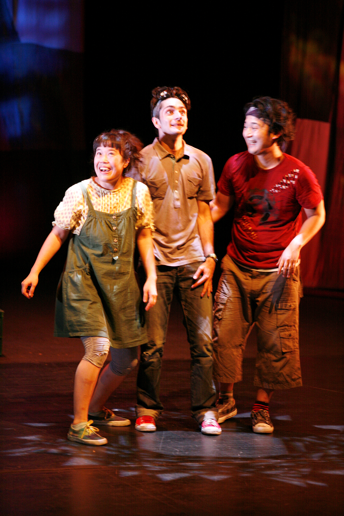 PWW: Taking our key question ‘What can we learn from children about working across cultures – how do they make friends with people that speak another language?’ into the research phase of the project was immediately productive. The question became ‘how do you make friends if someone doesn’t speak your language or comes from elsewhere?’, and asking this to young children across the three countries produced a surprisingly clear and unanimous answer, which could be summarised as ,”we play together, we eat together, and then we are friends.” This emerged from a series of drama exercises in workshops in Seoul, Tokyo and Birmingham, with a range of children aged 5-12. At the same time the artists in the project discussed our anxieties, and the anxieties of other adults around childhood. What evolved through the subsequent devising process, involving a series of creative workshops with mixed actors again in all three countries, was a story about three young children, playing alone on a building site, looking for a lost cat. We explored new ways of working physically without language, as well as exploiting shared references, and maintaining a mathematical balance to the story by distributing various well-known groups of three across the characters [so that for example the characters were ‘Nori’ [Korean for Yellow] ‘Aka’ [Japanese for Red] and ‘Blue’.]