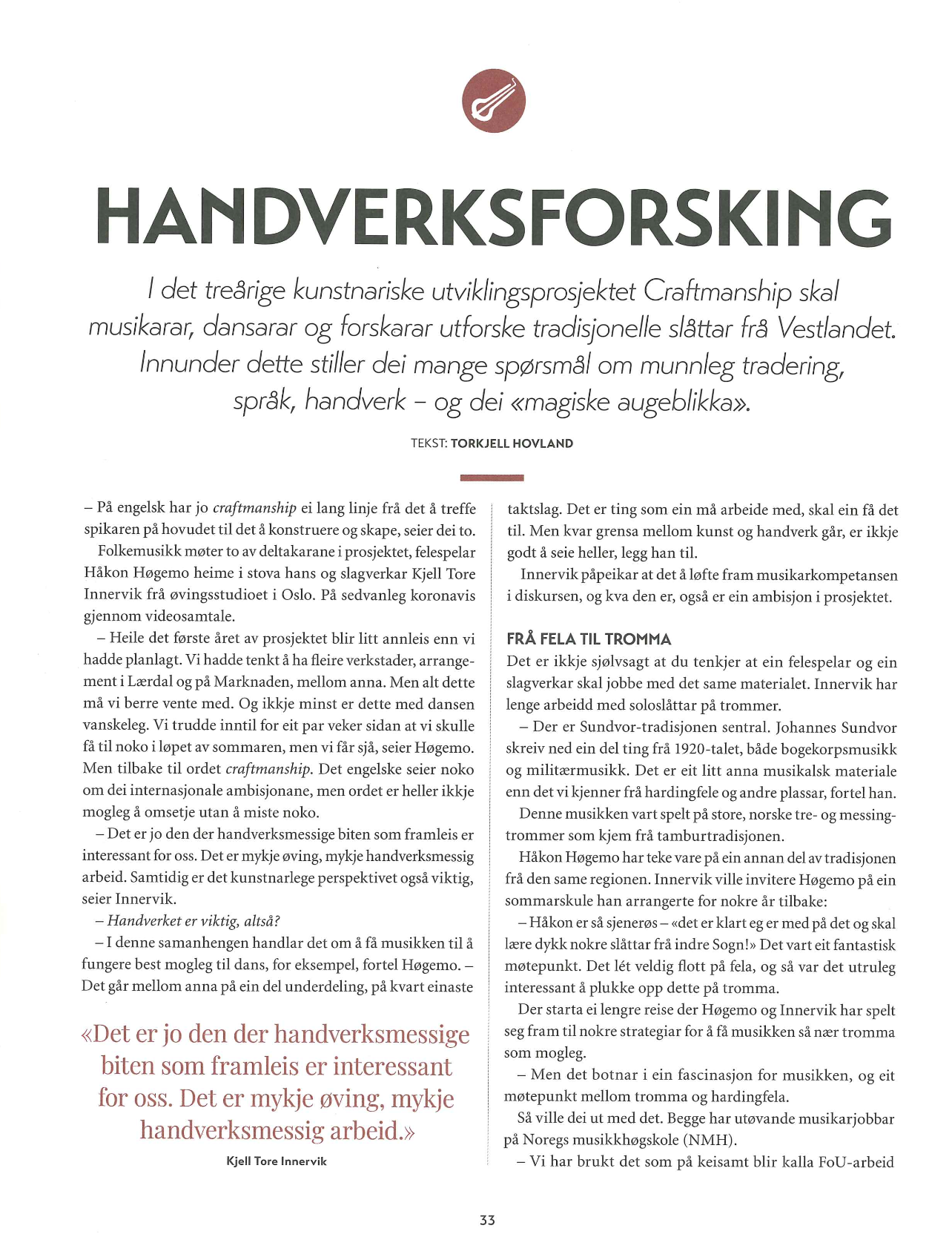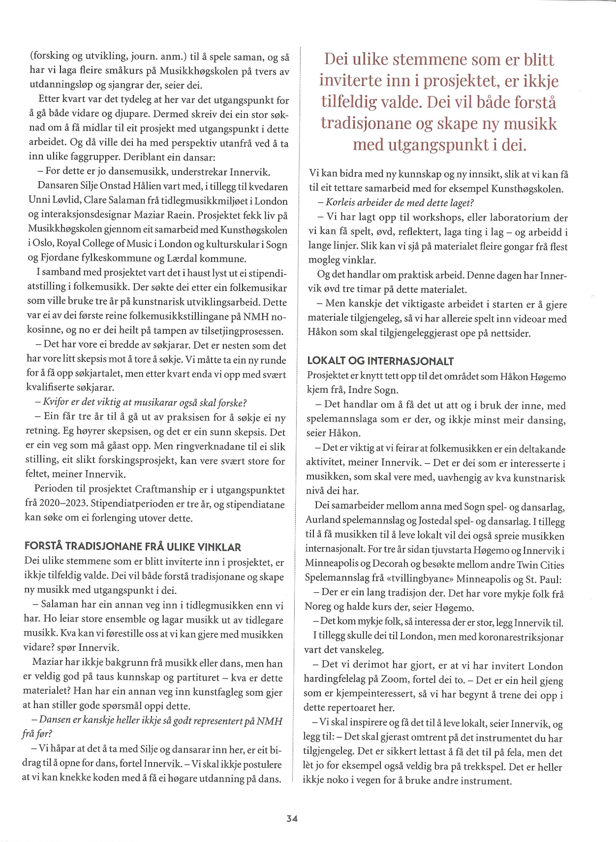 In the wider field as artistic presentations: for participants in the projects, London, USA, Noregs Tamburlaug, Folkorg, Kappleiker, Lærdals martnaden, 5 på Tvers, Kurs og seminarer i østlandsregionen, Folkehøgskolan i Ingesund, UIS, Nortrad, Nasjonal biblioteket