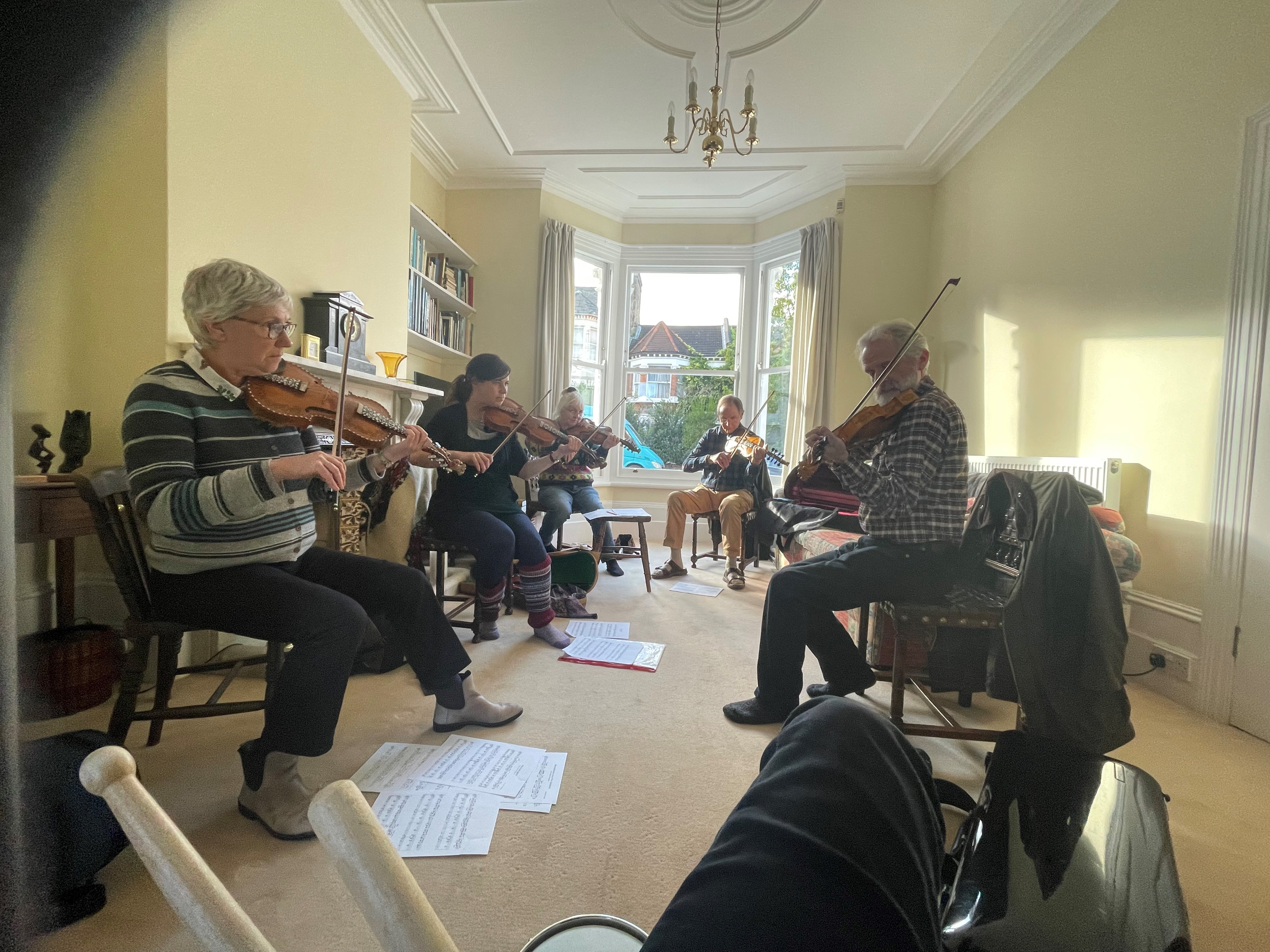 Oct 4. ### Workshop with London Hardingfelelag. Clare Salaman and Håkon Høgemo, Anders Nedreli, two halling