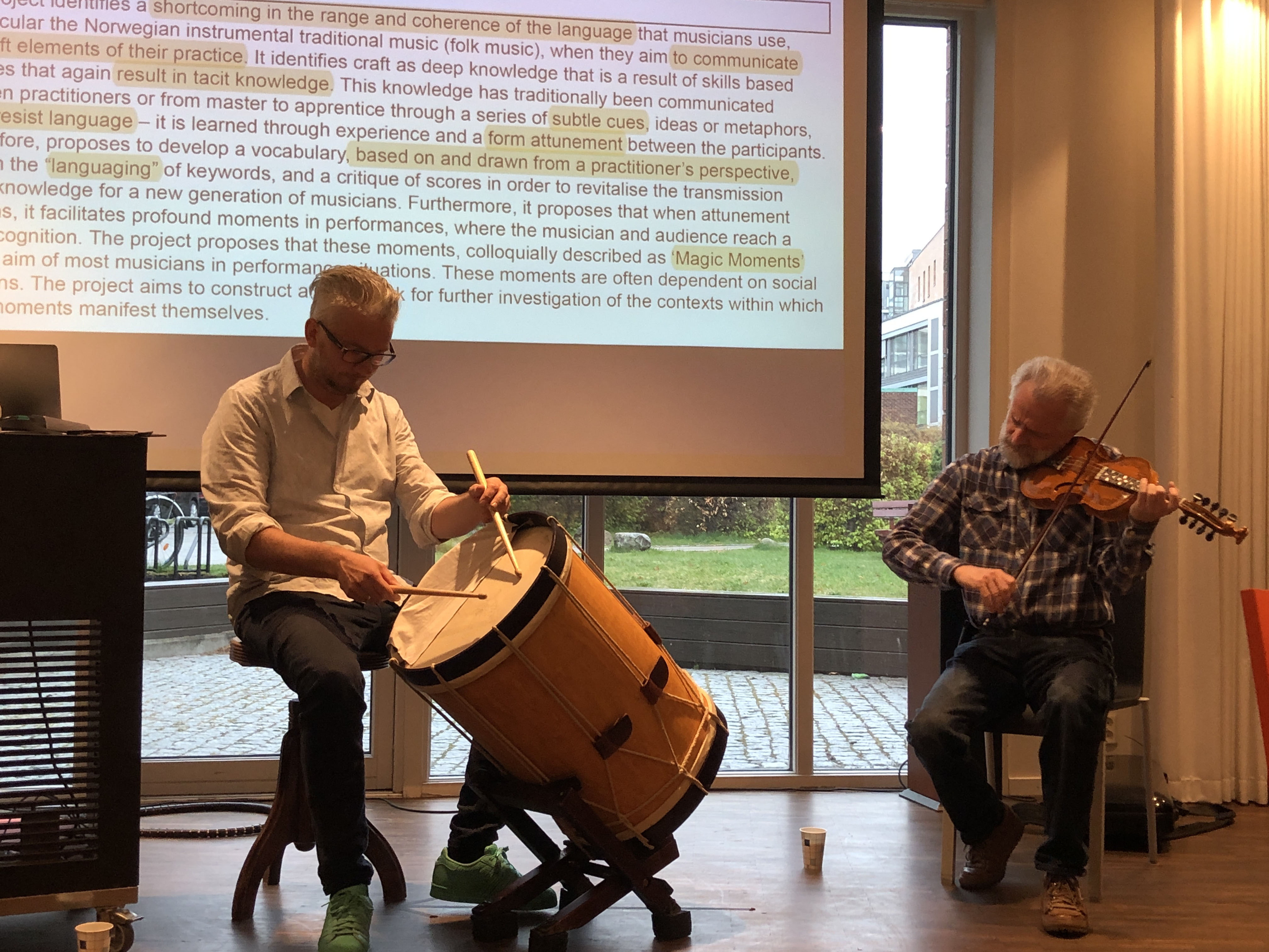 Workshop one, with Birger Mistereggen and Kjell Tore Innervik on the Norwegian tradition of drumming. Trommeslåtter as collected by Johannes Sundvor (Bergen) passed along to us by his grandson Eirik Sundvor. Archive material as sound/video/manuscripts are to be located and made available to the wider community. The ambition of making two mini conferences during the project period were discussed. We also spent some time putting the tradition in context, and international contacts are to be made in Europe.