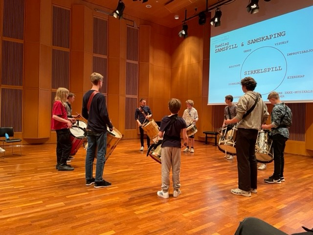 Youth from Voksen skoles musikkorps and Musikk på Majorstua learning traditional drumming.