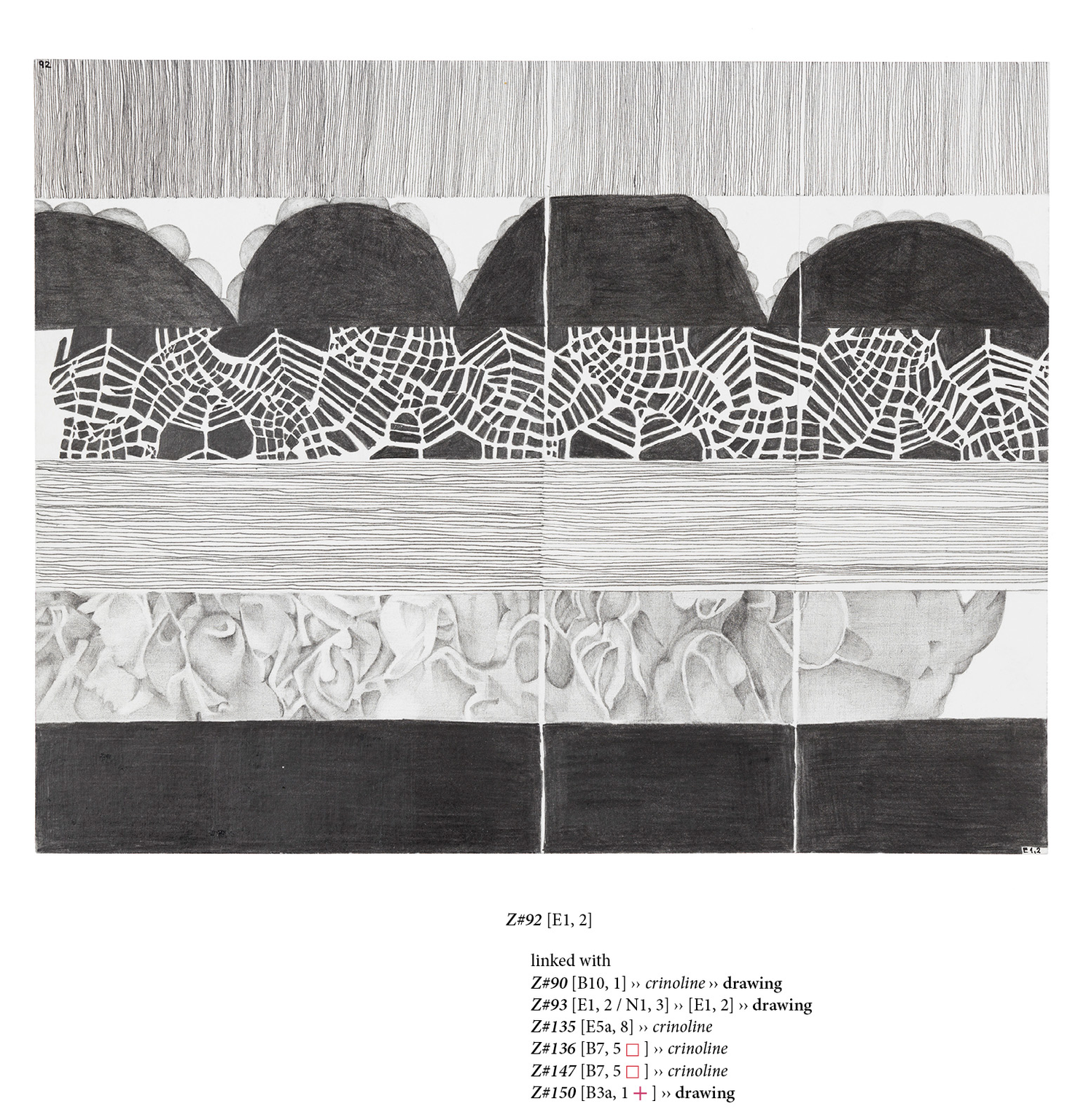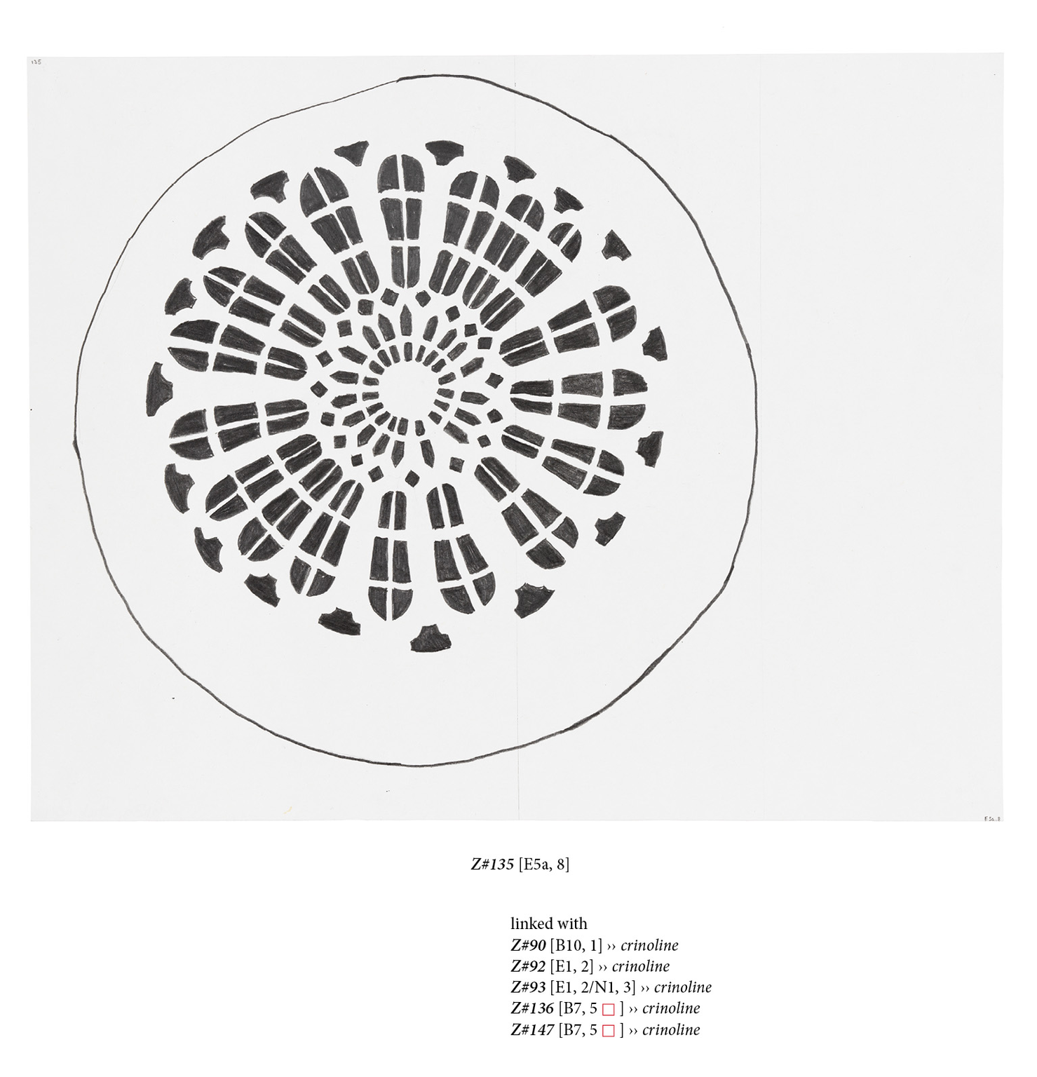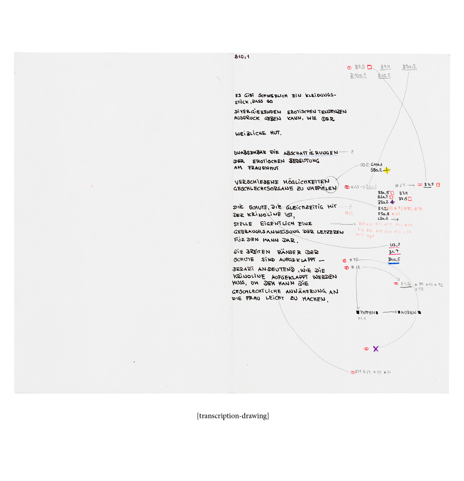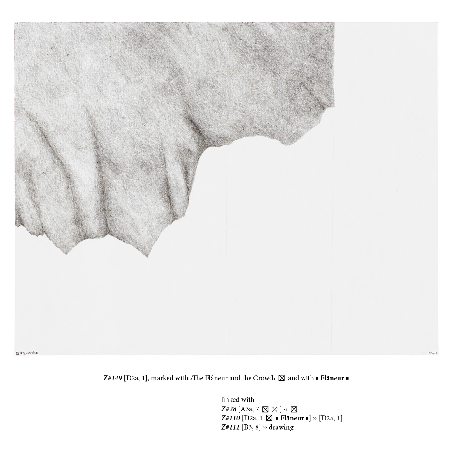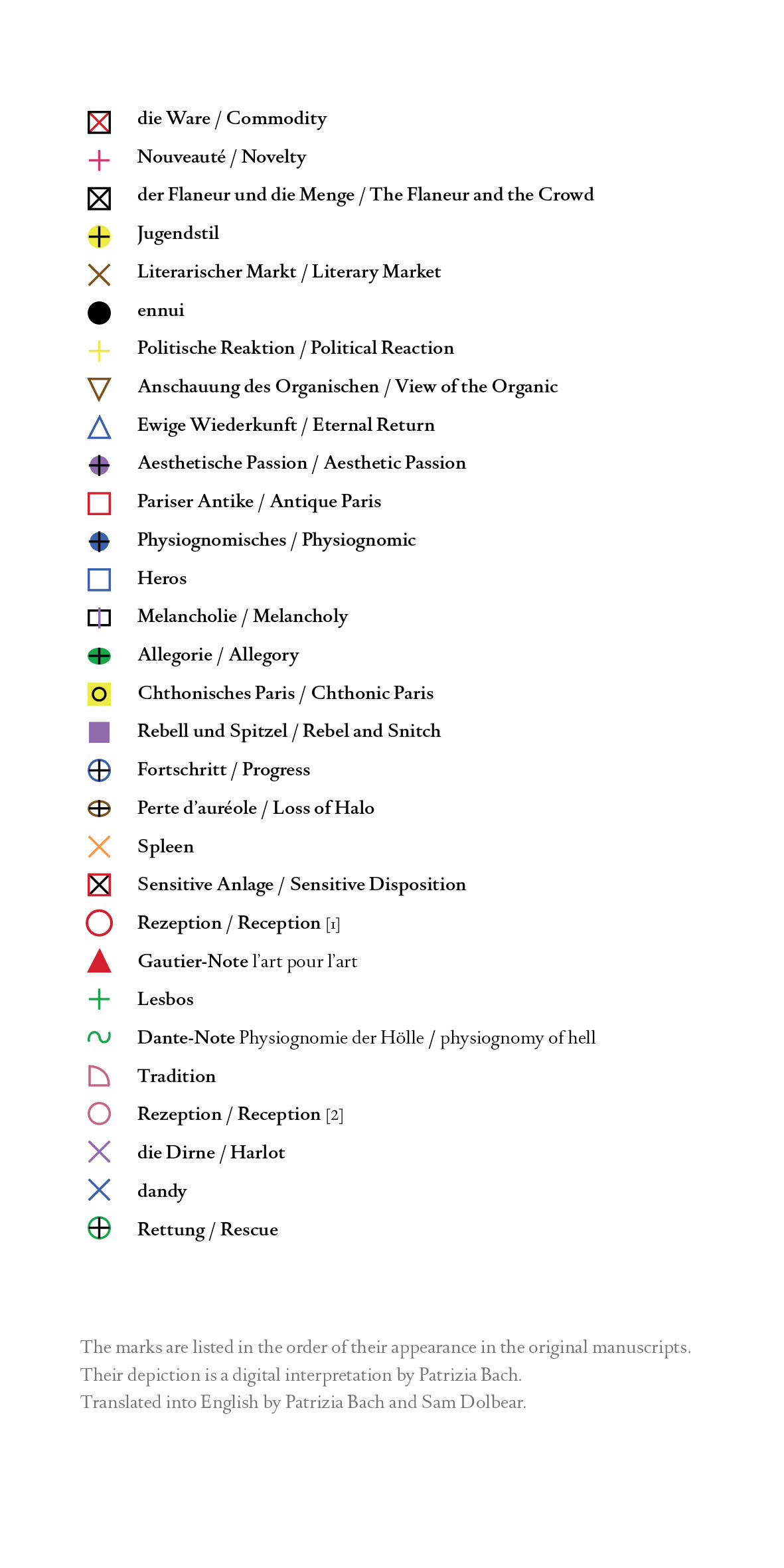All drawings: crayon or pencil on paper, 22 x 28 cm (like Walter Benjamin’s manuscript pages) ©Patrizia Bach, 2021 / Photographs: Gunter Lepkowski, Berlin. The depiction of Walter Benjamin’s ‘marks’ is a digital interpretation by the artist (see: www.Benjamin-Passagen.de). Their interpretation is taken from: Giorgio Agamben, Cronologia dell’opera e notizie sultesto, in: Walter Benjamin: Parigi, capitale del XIX secolo, Turin 1986, p xii–xii. Translation of the marks into English: Patrizia Bach and Sam Dolbear.