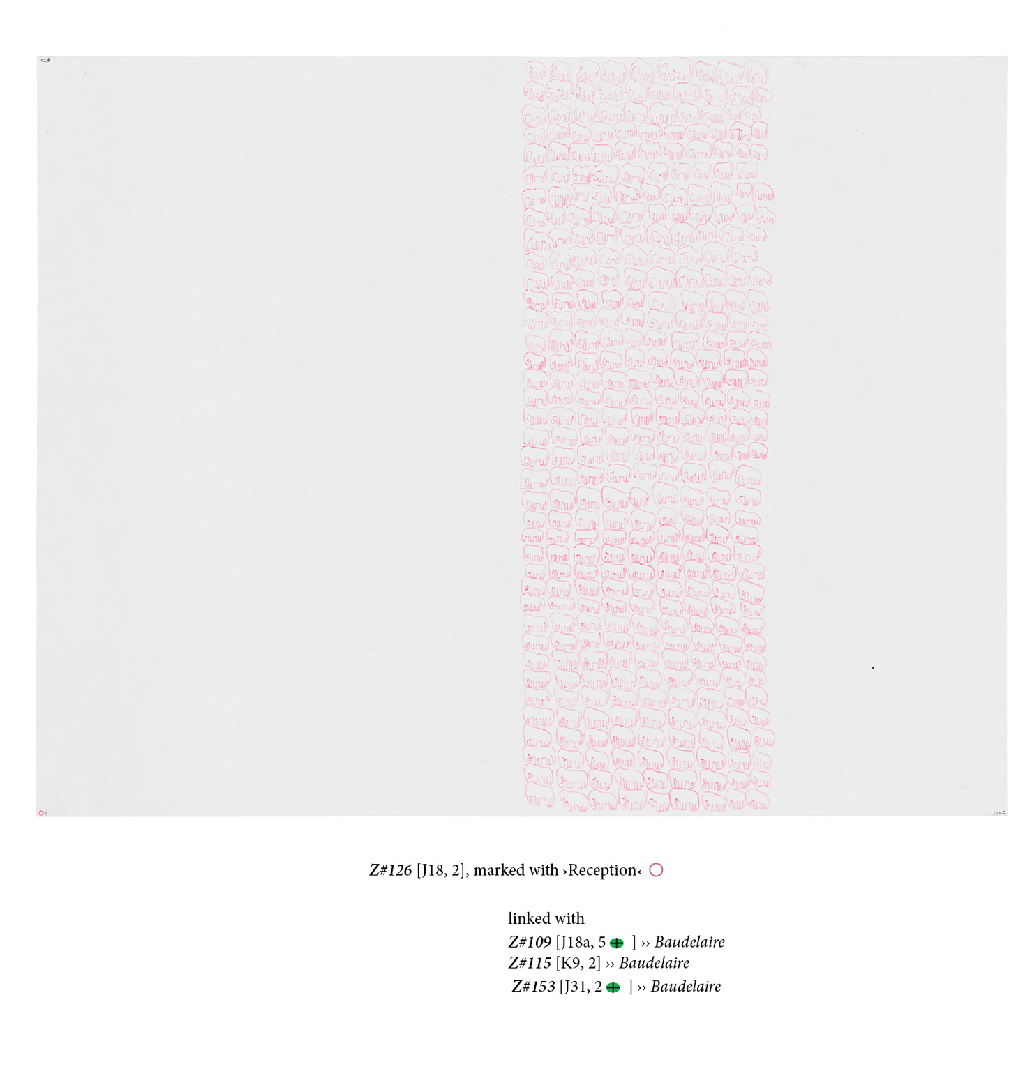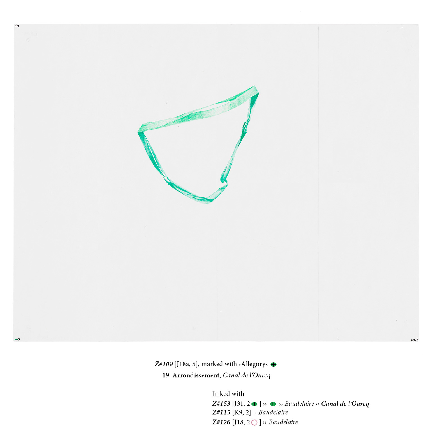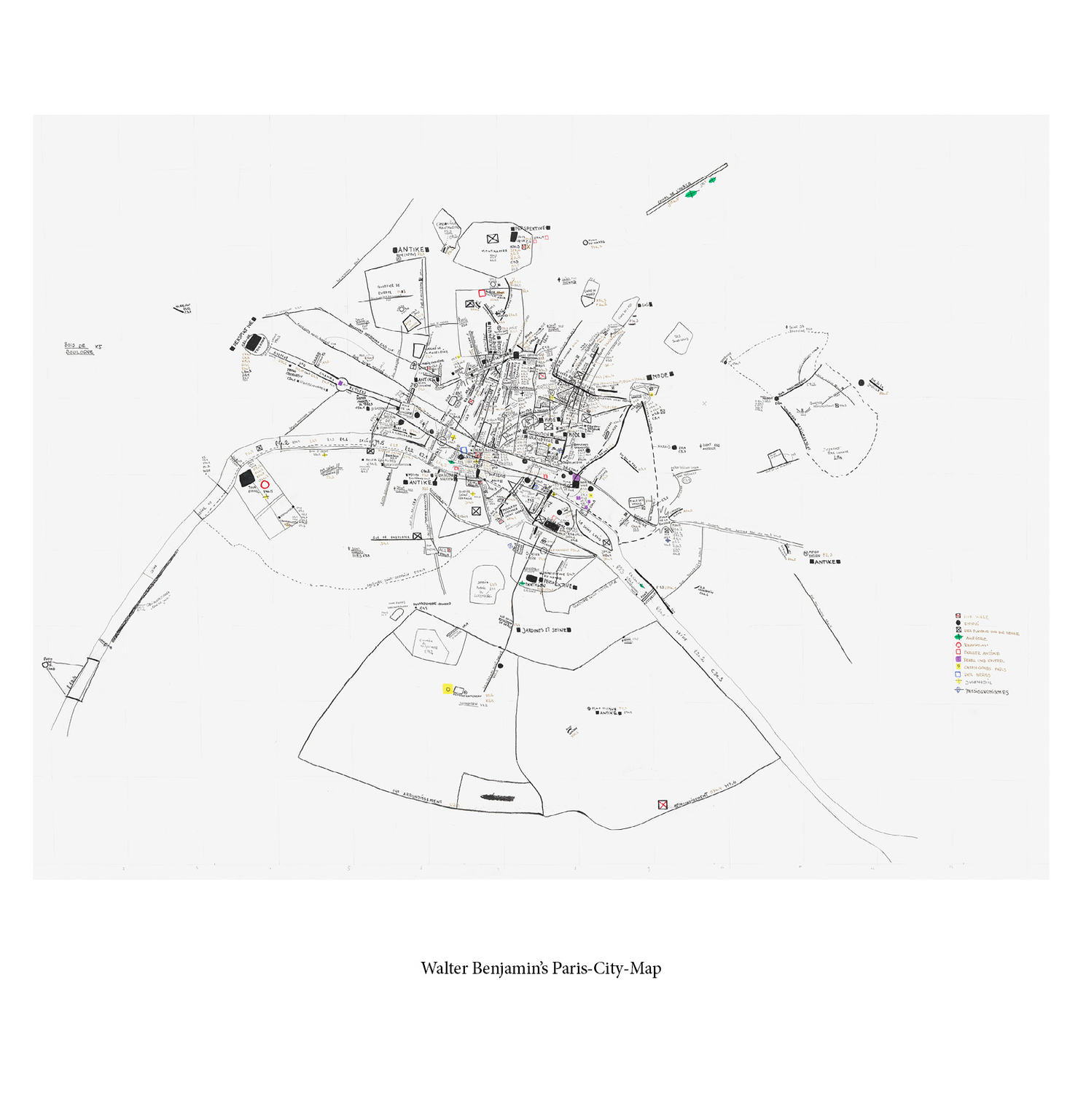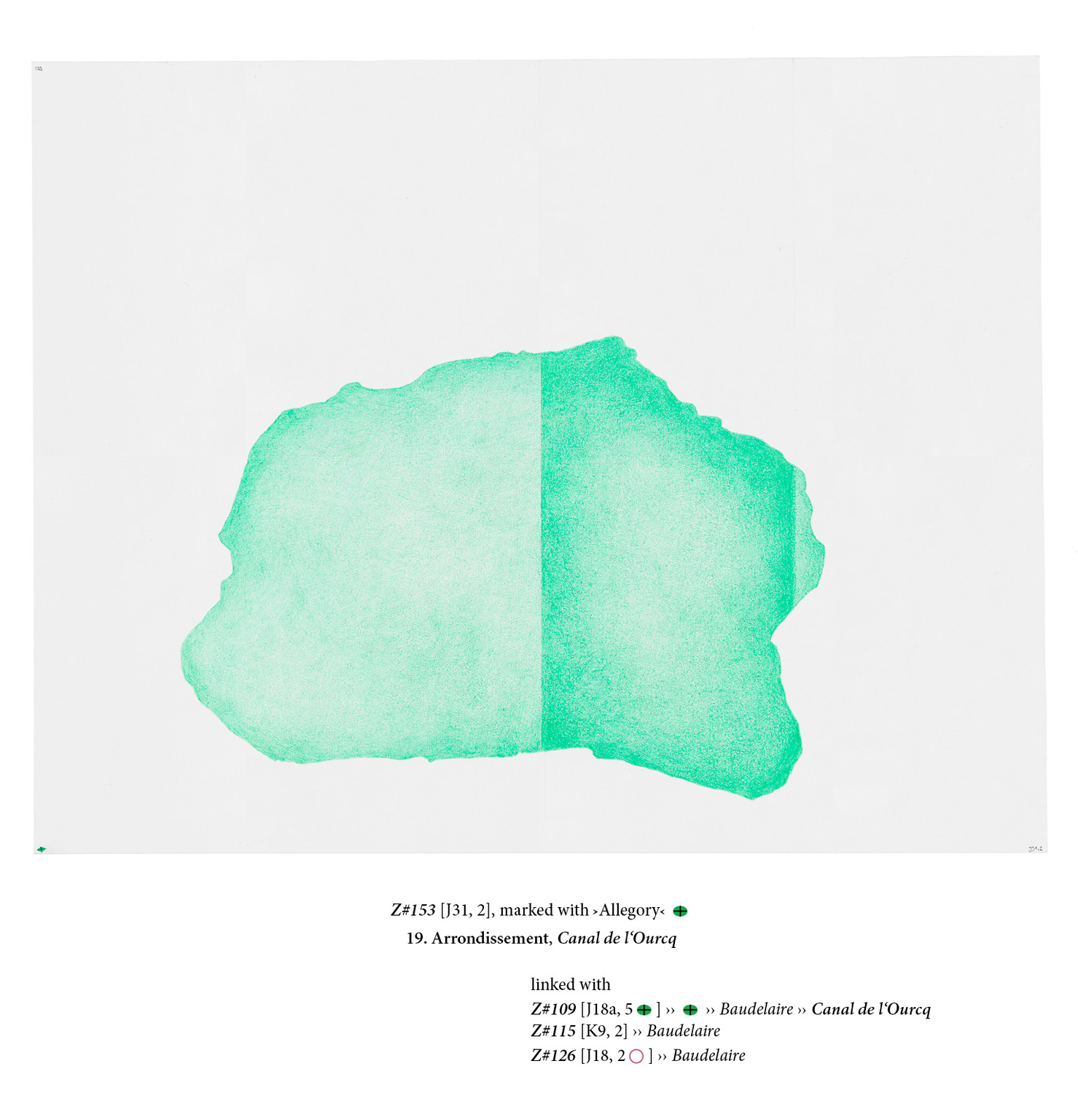 Ever since Patrizia set eyes on the Arcades manuscripts in the Walter Benjamin Archive in Berlin in 2012, she cannot cease reflecting on their unique qualities. The meticulously executed pages and their countless coloured markings appeared to contain meanings otherwise lost in the subsequent editions of the published work. Benjamin created connections within his notes in a number of ways: through the ‘convolutes’ he constructed, through the marks-symbols (see legend of marks below), and through words buttressed by black boxes, inserted the end of certain fragments (see D1,1 on right margin). Emanating from a graphic interaction with the work, a number of projects emerged: Patrizia followed in Benjamin’s footsteps to Paris and translated his coloured symbols into an online digital format: www.benjamin-passagen.de; she also built up a series of over 150 drawings that take up Benjamin’s methodologies.