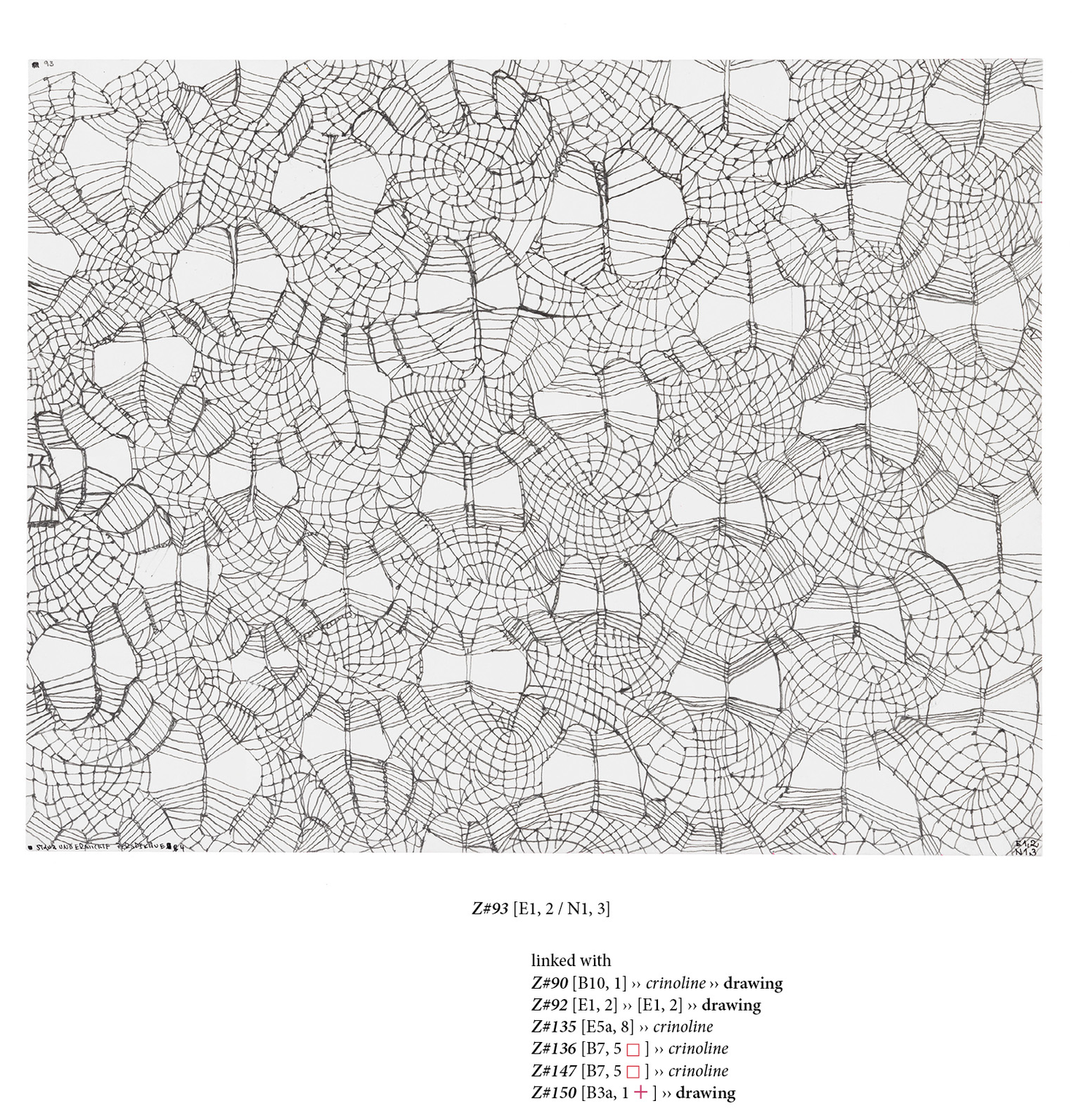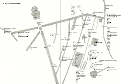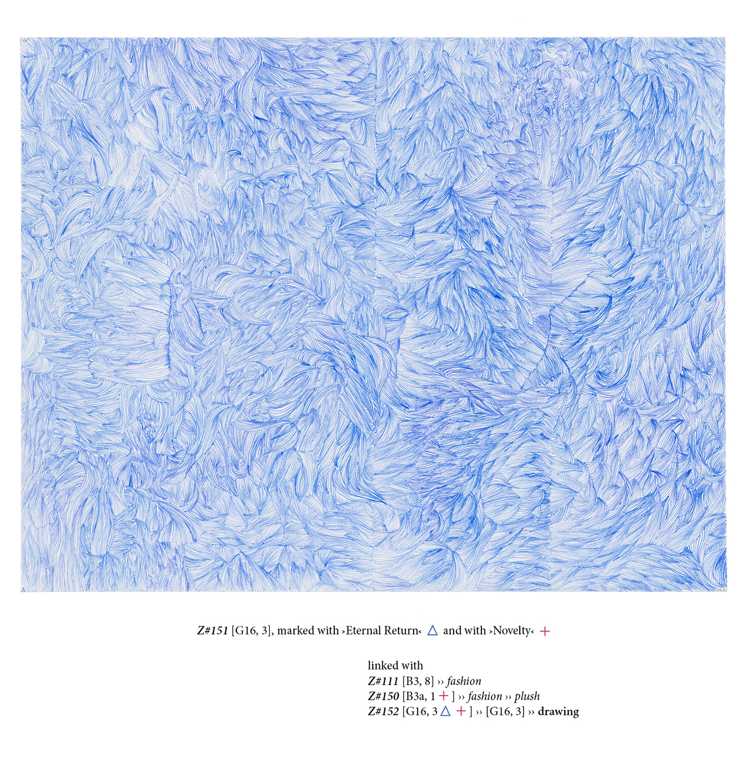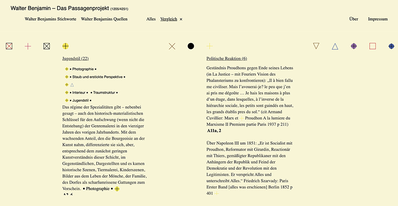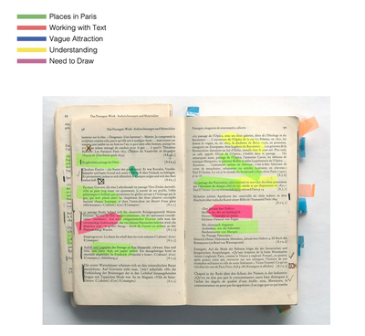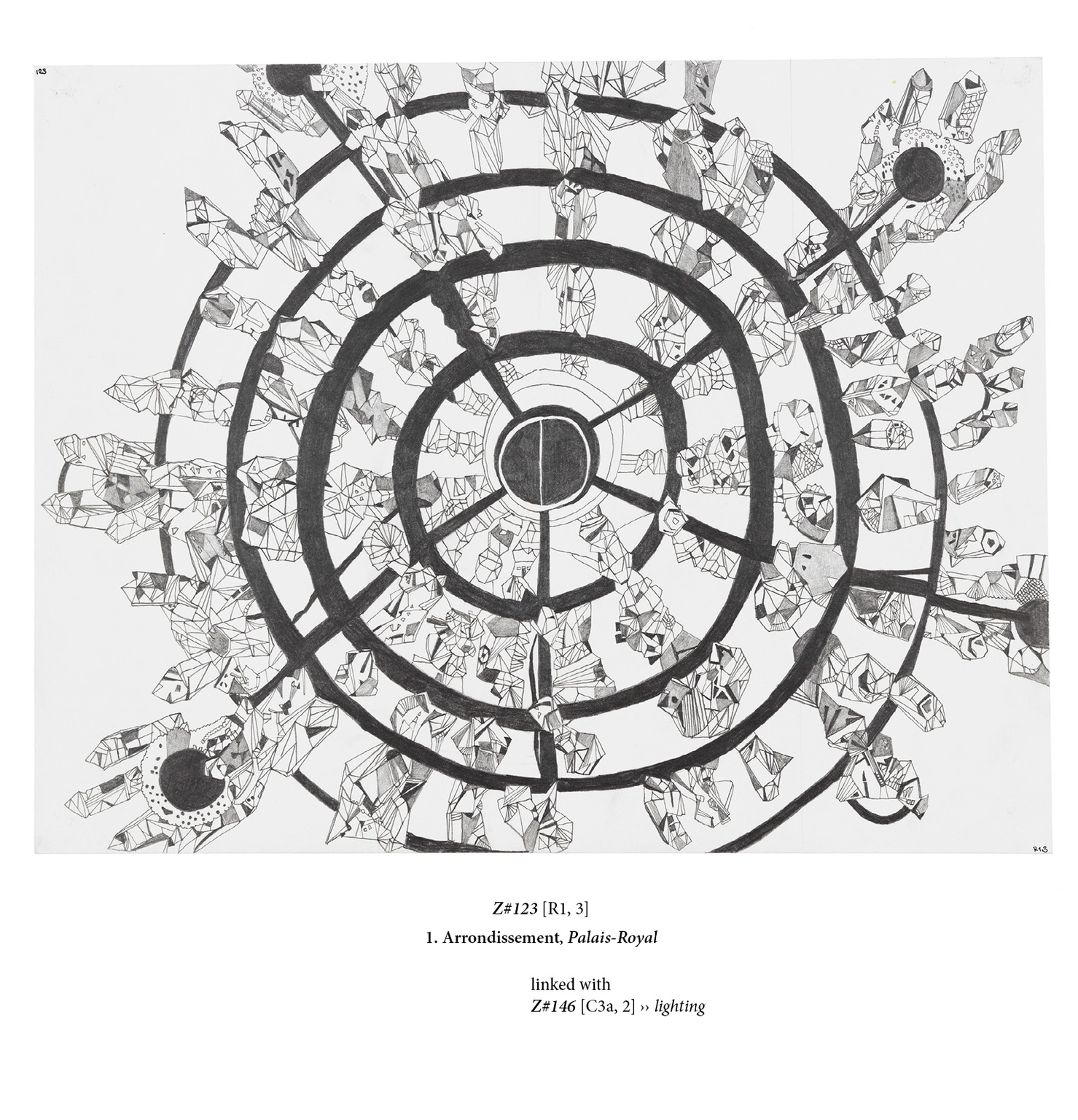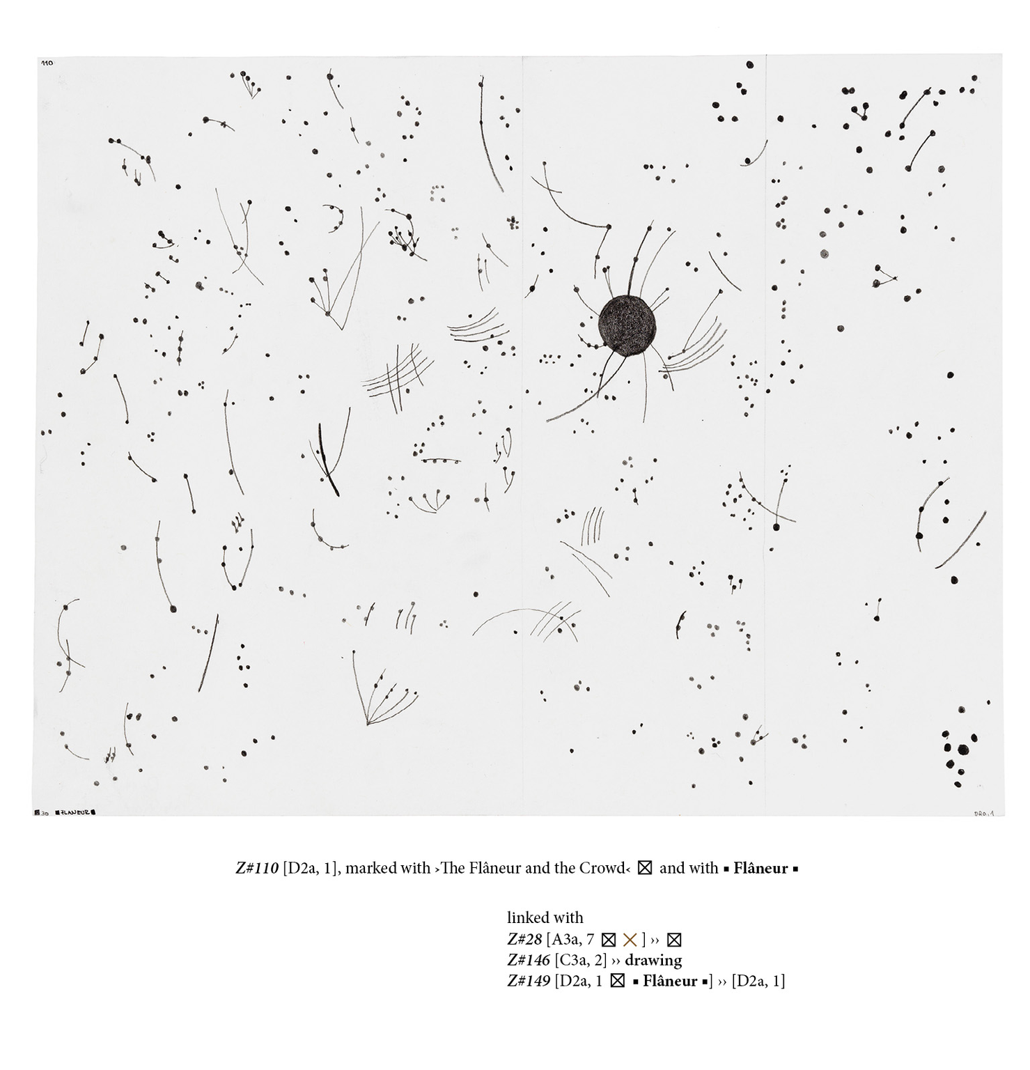 Ever since Patrizia set eyes on the Arcades manuscripts in the Walter Benjamin Archive in Berlin in 2012, she cannot cease reflecting on their unique qualities. The meticulously executed pages and their countless coloured markings appeared to contain meanings otherwise lost in the subsequent editions of the published work. Benjamin created connections within his notes in a number of ways: through the ‘convolutes’ he constructed, through the marks-symbols (see legend of marks below), and through words buttressed by black boxes, inserted the end of certain fragments (see D1,1 on right margin). Emanating from a graphic interaction with the work, a number of projects emerged: Patrizia followed in Benjamin’s footsteps to Paris and translated his coloured symbols into an online digital format: www.benjamin-passagen.de; she also built up a series of over 150 drawings that take up Benjamin’s methodologies.