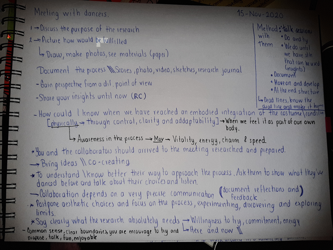 Based on the insights of previous practice, I tried to integrate the dancers in the costume design process. You can find below images of my journal with the description and reflection of this intervention.