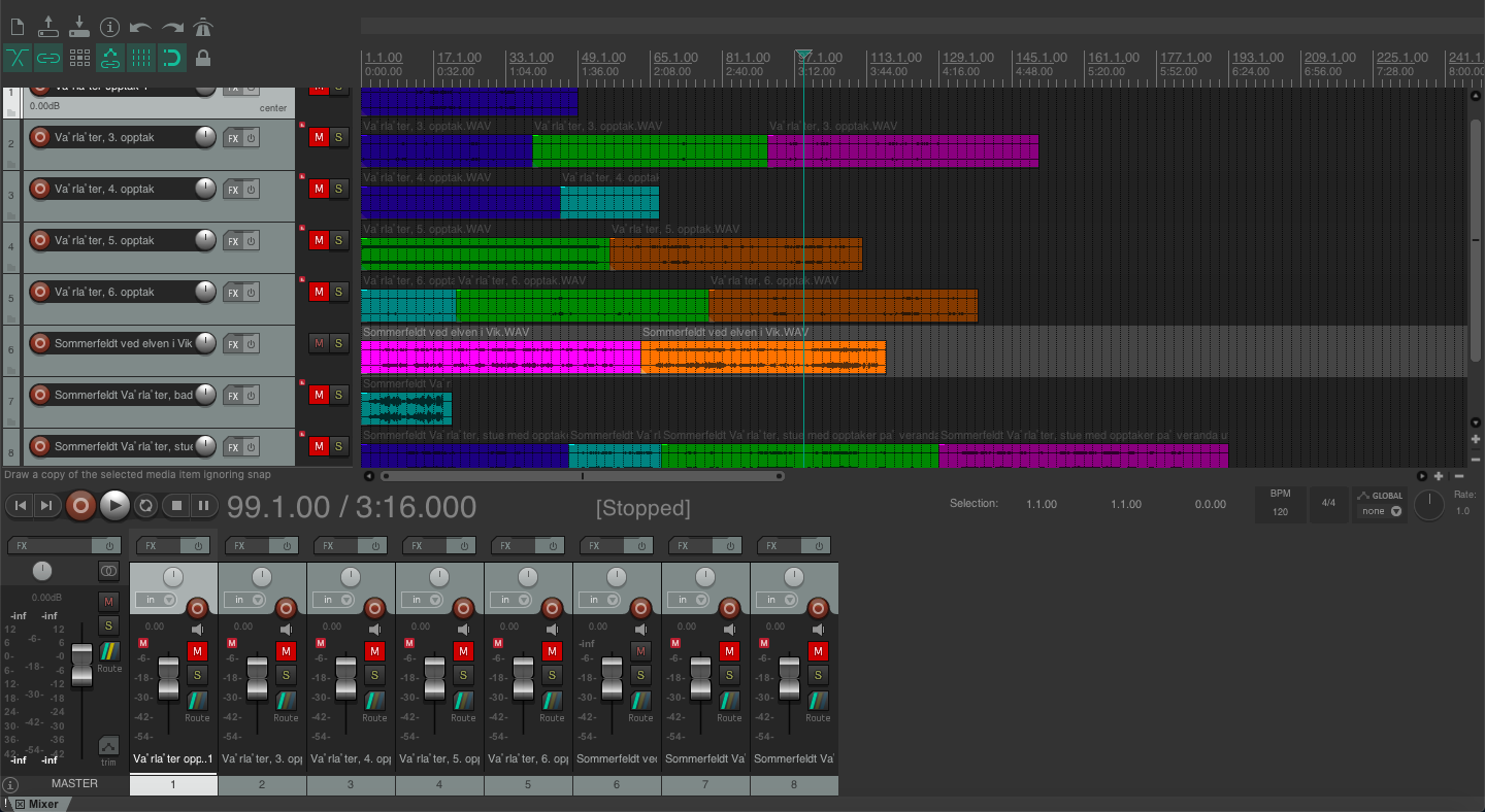 Da de opptakene som ikke skulle være med videre var slettet fra prosjektet så arbeidet i Reaper slik ut: