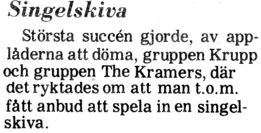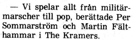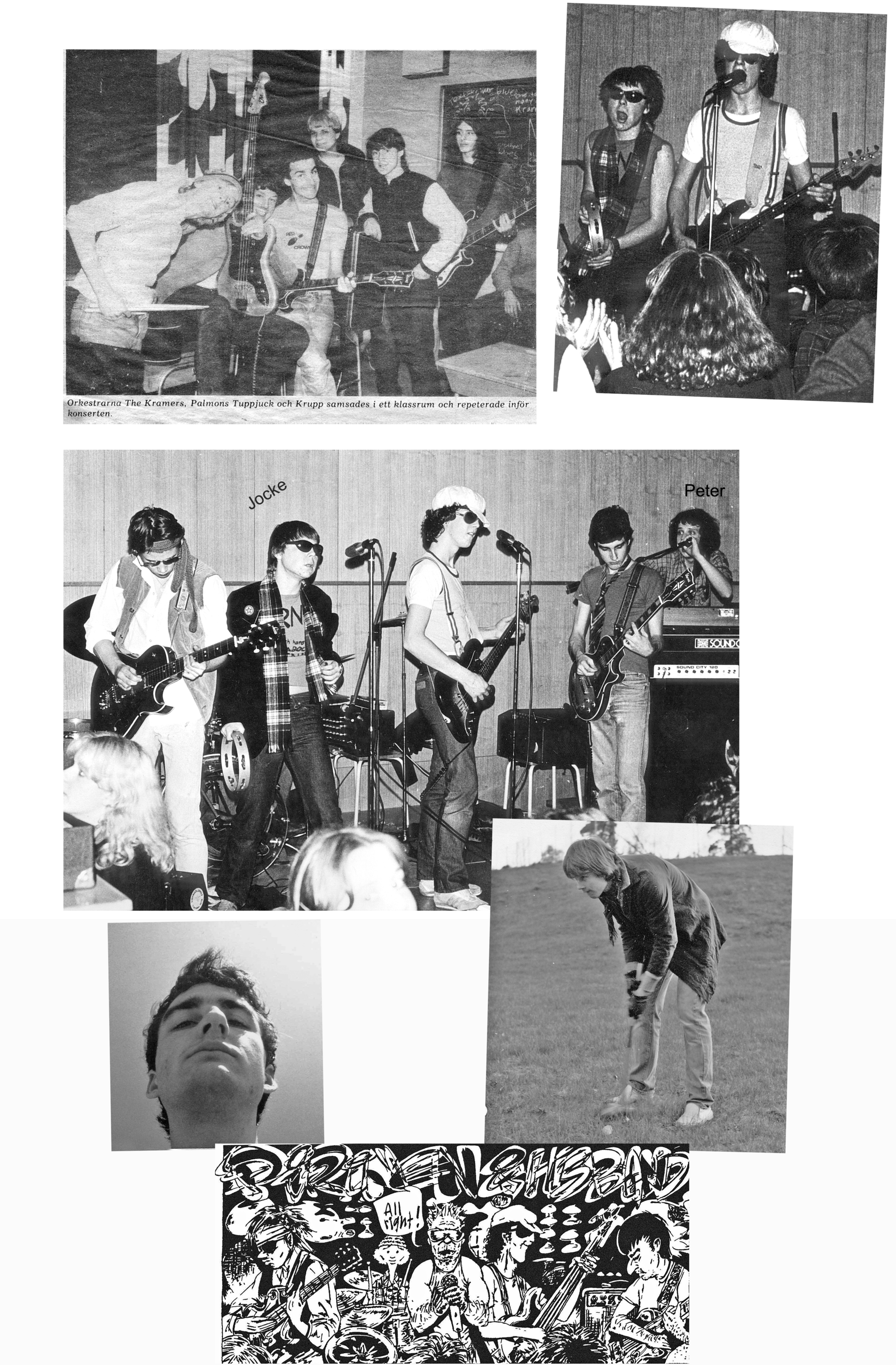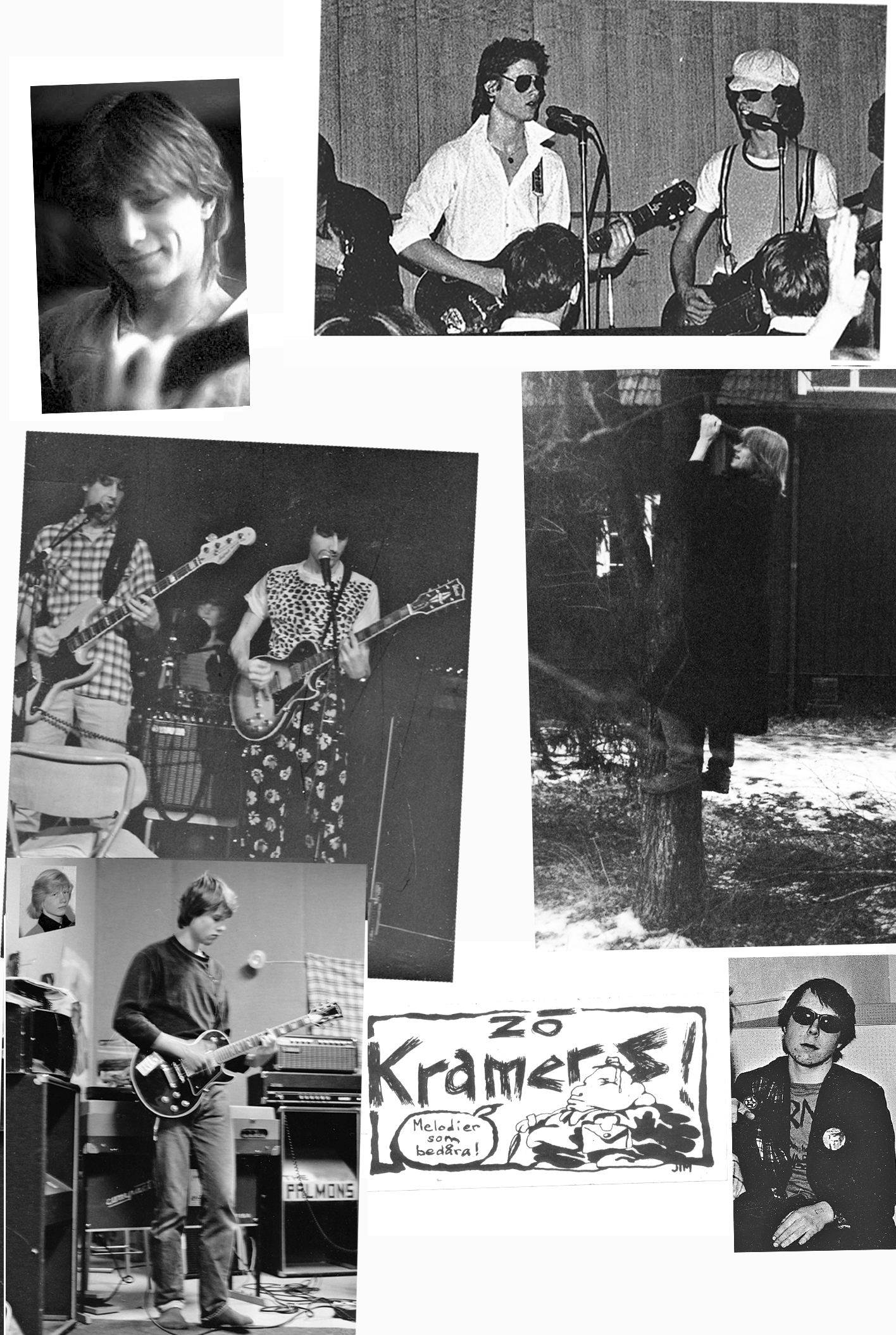 Zö Kramers was an orchestra in a mix of punk, reggae, ska, marching music, blues, pop, rock but not jazz. Participating in various roles: Calle Ottestam / bass, vocals, lyrics, music Per Sommarström / guitar, vocals, lyrics, music Martin Fälthammar / drums, text Olof Halldin guitar, keyboard, music, voice, percussion, mixing Mikael Södersten / keyboard, vocals, lyrics, music in addition Peter Söderblom / synth Persa Jacobson / text Katte Salomon / song Joakim Pirinen has drawn and written texts For individual bets - click on "Vilka Vem När Var Hur Vad". History: Zö Kramer's original composition was Calle Ottestam, Per Sommarström, Olle Halldin, Martin Fälthammar and initially Peter Söderblom. Added after about a year did Mikael Södersten. First on drums was Jolly Bod but was soon replaced by Martin. Katte Salomon also sang on the recordings from 1983. Music and lyrics were written by the band members but lyrics were also written by Joakim Pirinen and Persa Jacobson. The band's first name was "Arne & his anabolic steroids". The name "Zö Kramers" comes from Kramer-Pollnow's hyperkinetic syndrome - (dance disease) a psychotic condition characteristic of the band's dance-inspired style. Between 1978-1983, about forty songs were written. About twenty concerts were mostly held on Lidingö. The band's biggest "hit" was Tyska marionetter (German puppets). Live recordings have been available since the beginning and about 25 concerts were performed, but more studio mixes were made in four rounds where the first was done in 1979. Recording was done with a four-channel TEAC tape recorder and TEAC mixer table. Sound improvements were made in 2002 at the same time as digitization and in 2020 before the launch of this website.