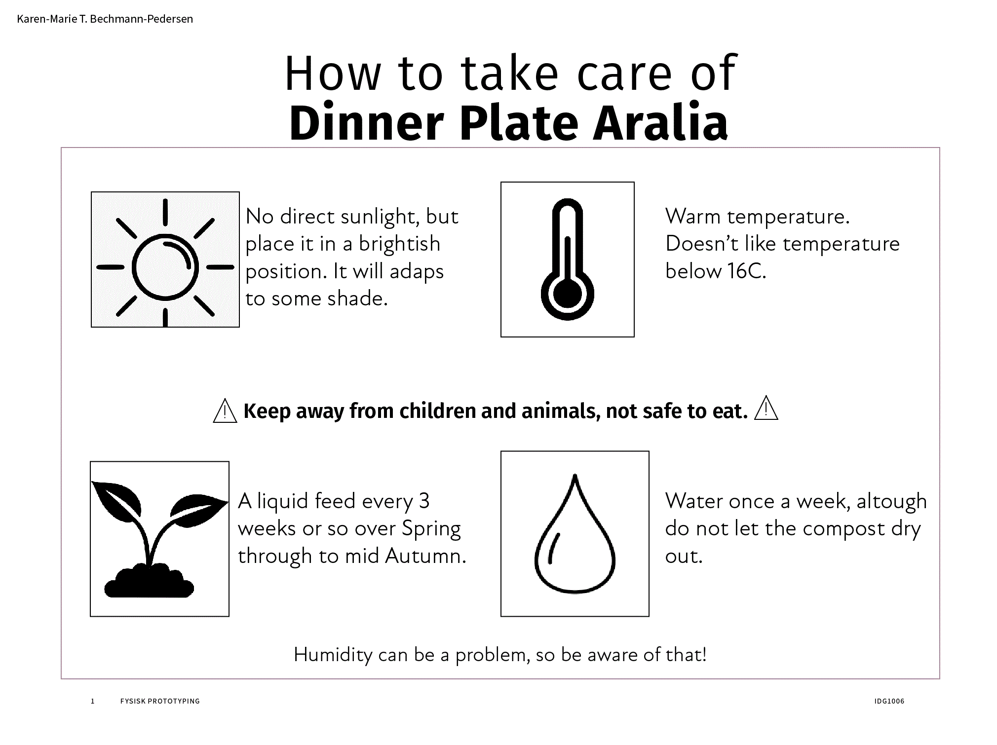 I had 12 sketches to choose from and I had to choose 4 of them to continue developing and working on. When I looked at all my sketches, I had to imagine how easy they would be to conduct, the time it would take to perform and if I had the right things to make it. I did not want to overdo myself and be too eager with this project. So I picked the four sketches that I liked and knew was not too complicated to create. This of course led me to let go of some of my best ideas, but I knew this would be complicated and not knowing if it actually would turn out okay. Knowing I had never done anything like this before, only some in arts and crafts in elementary school. So choosing the signs was essential for my further work. I found it a bit difficult to choose only four because I did not have any idea of what I wanted to end up with, it would have been nice to see some examples of what we could end up with when we were done. Maybe a couple of reference photos or someone’s previous work. Just to have a clue of what we are ending up with. I also talked to the others in my cohort just to get a reference of their thoughts and what they think we might end up with. We all knew that we would end up with a plant with a self-watering system and with a sign with the plants need, or a QR-code that shows what the plant needs. I created a full scale of paper prototypes of the four I liked the best, and made a fitting by the plant to see which one of them suited best with the plant. I also asked my mom if she had any preferences, but she actually liked all four of them pretty good. Not grabbing to much attention but enough for the user to see and recognize and maybe thing “this is some important information that I might need to take care of the plant”. I wanted to make a Problem Statement for my plant based on my previous experiences with plants. I came with the conclusion on my statement being that people often tend to buy plastic plants because they forget to water their plants and thinks it’s a lot of work. So I figured out my goal is making my plant as easy to have as possible, not much for the user to actually do but finding a good place for the plant to be.