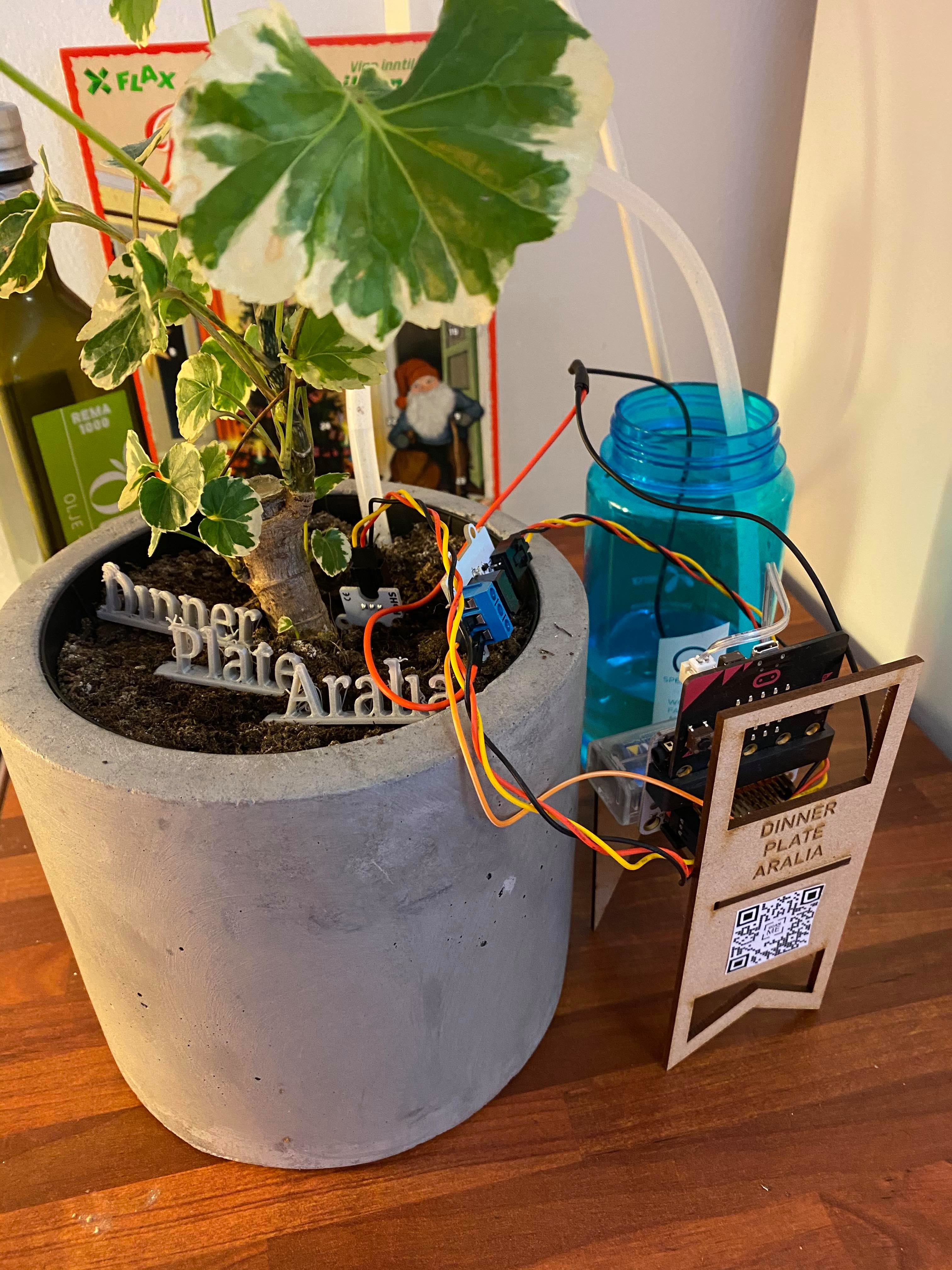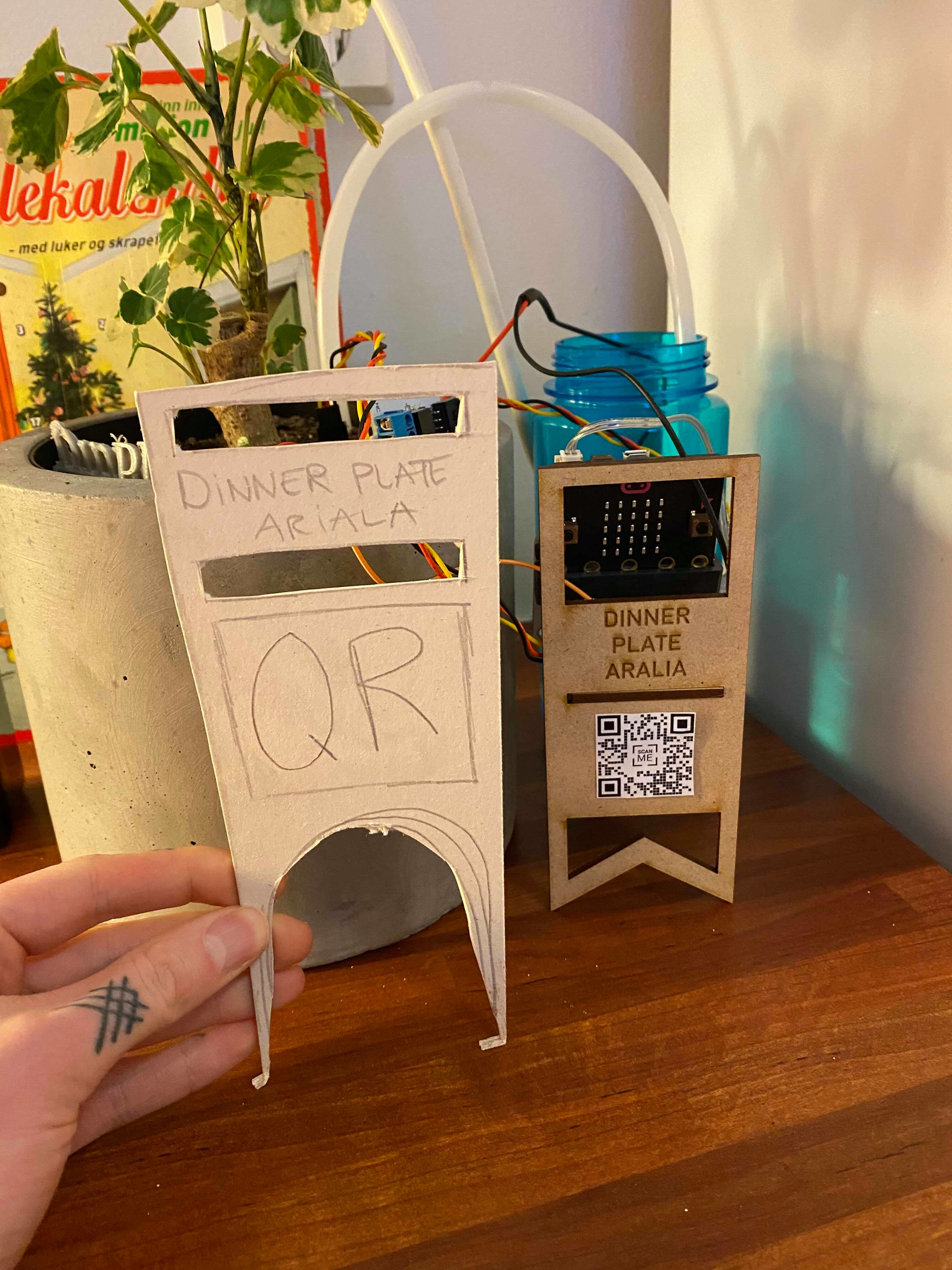 So now I have the micro:bit, my 3D printed “Dinner Plate Aralia” – sign, and my laser cutted sign. Now I have to fix it up all together somehow. My first mission was to attach the micro:bit with the self-watering system to the laser-cutted sign, and all the measurement that I had been taken it was fitting perfectly, but I did not had in mind that the wires at the front would look so bulky. So they are kind of everywhere. I had to make some adjustment to think of something clever to hide the wires in a way, but still be functional to work. The laser cutted sign did not have the QR-code on it, and I don’t know why. When I picked it up at school, it was supposed to have the QR code beneath the name of the plant. It was a bit of a bummer, and I found it a bit strange since I saw others in my class have the QR-code on it. I decided I print out the QR-code and glue it on instead since my QR-code was not included in the carving. Another problem occurred when I tried to scan the QR-code that I had creating trough this website, since you had to pay a monthly sum for the code to still stay active it had been deactivated. But I did actually liked the paper version better, since the phone could apparently not read the QR code that was laser cutted into the surface. But at least now it is readable, its just not activated.