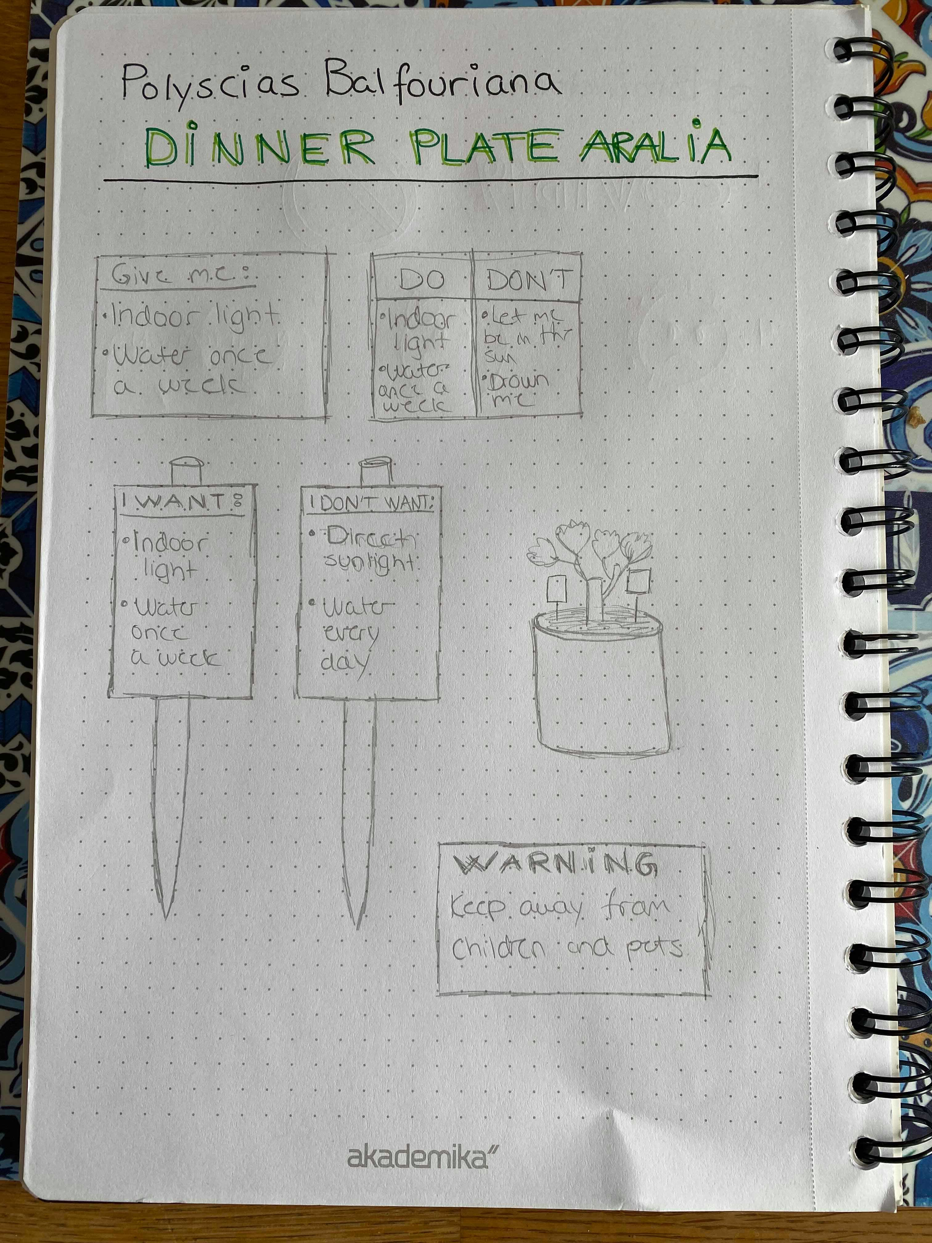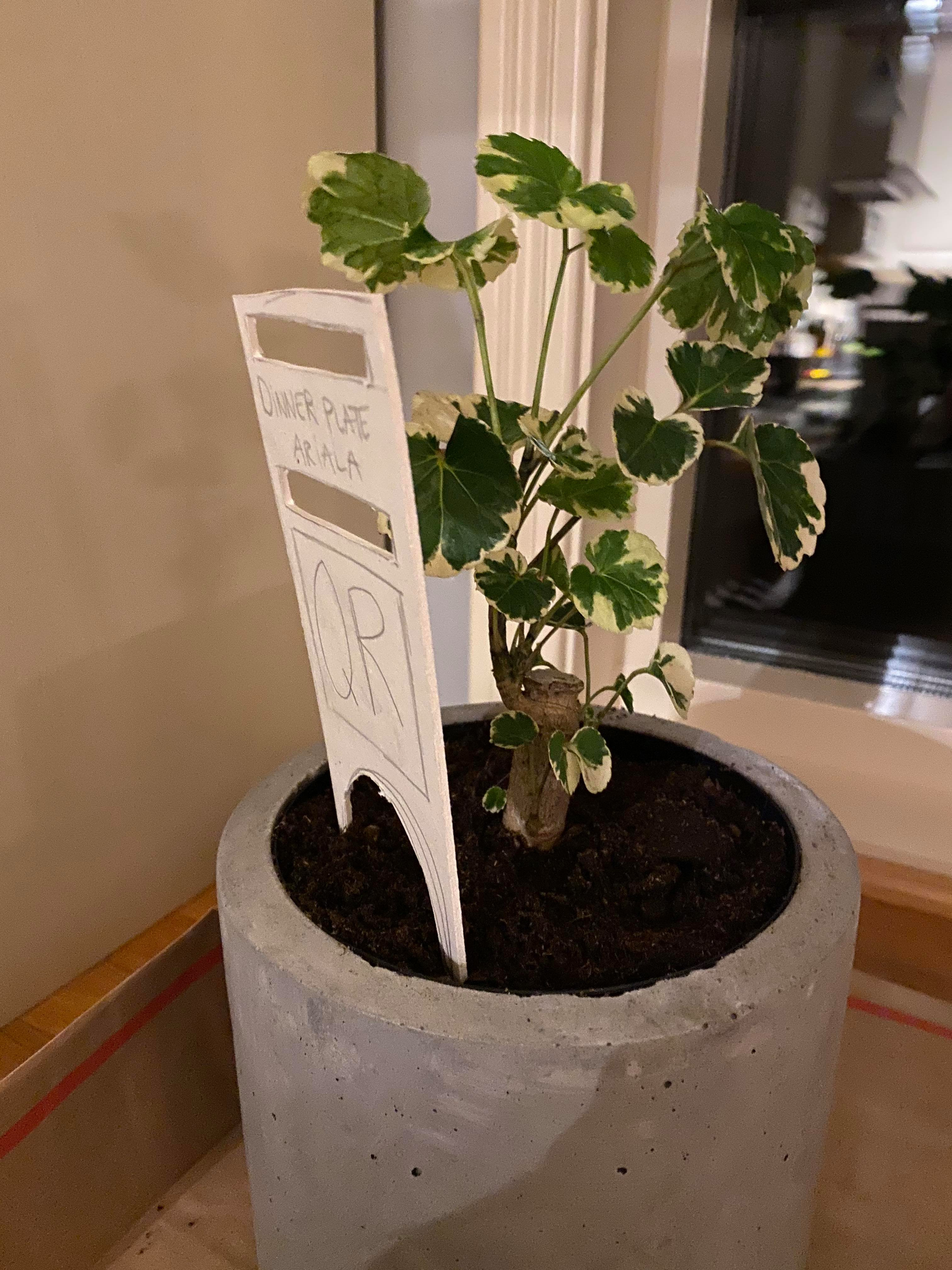 I placed the different cardboard signs in the pot one after one, and asking these questions to her. She wanted a little picture on the sign with the plant on, so she makes sure it hasn’t been switched up somewhere. She would like a spec on when it last was watered, a thermometer, a moistures meter or an alert on when she should water it. A warning sign, since the plant it poisonous, a clear warning. More specs in the QR-code. More of the important information on the sign. In the QR link it should be specified if it should perhaps have a bigger flowerpot. I some of the things she said in the usability testing. Taking all this feedback I got from her I had to rethink a lot of things, after deducting this usability testing, she gave me some tips that I had never thought of. Like when she mentioned a sign saying when it was last watered. This gave me some new factors to take in consideration for further development on the plant. So I once again started to sketch to figure out if I could fit all this information on the sign. One challenge I had was that I was unsure on how I could fit so much information on a sign, even if I shortened it down. I knew I had to have the warning sign, but I though the sign where I have information about when it was last watered was a bit unnecessary since it will eventually water is self. But at this point I did not know that, so I had to work my way around it. I also concluded that I might use the micro:bit an code text saying when it was last watered, as well as a warning. So performing this user testing it gave me some new aspects on how others might vision the plant, since I already knew a lot of this plant. That it needs watering once a week, etc. I found it very useful and I gained a lot of insights.
