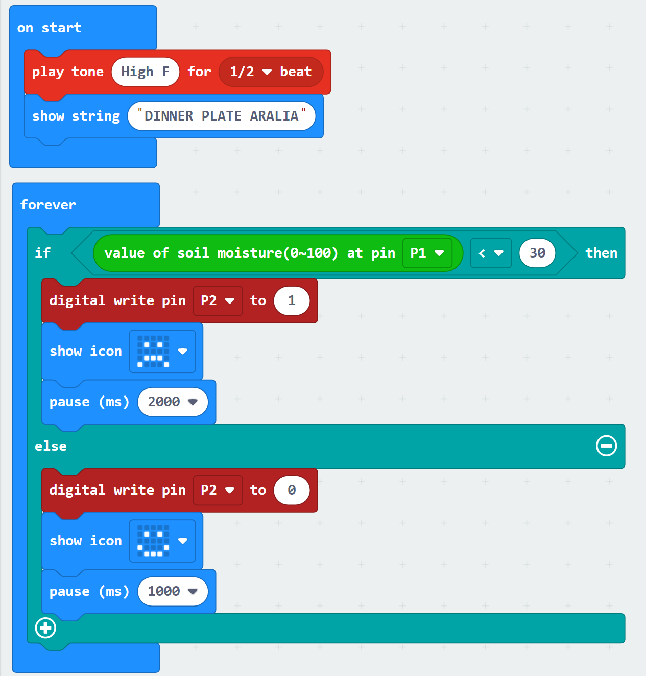 In the beginning I plugged the micro:bit to my computer using a portable micro usb. I startet playing round and made a melody for it to play when it first starts up, I also added a rolling text with the plant name “Dinner Plate Aralia” scrolling over the page for the user to read. Also when you shake the chip it gets an angry face, and when you lift it up it gets a heart. Then press A and it smiles. I did this because I wanted the chip to have emotions, making the plant feel more alive.