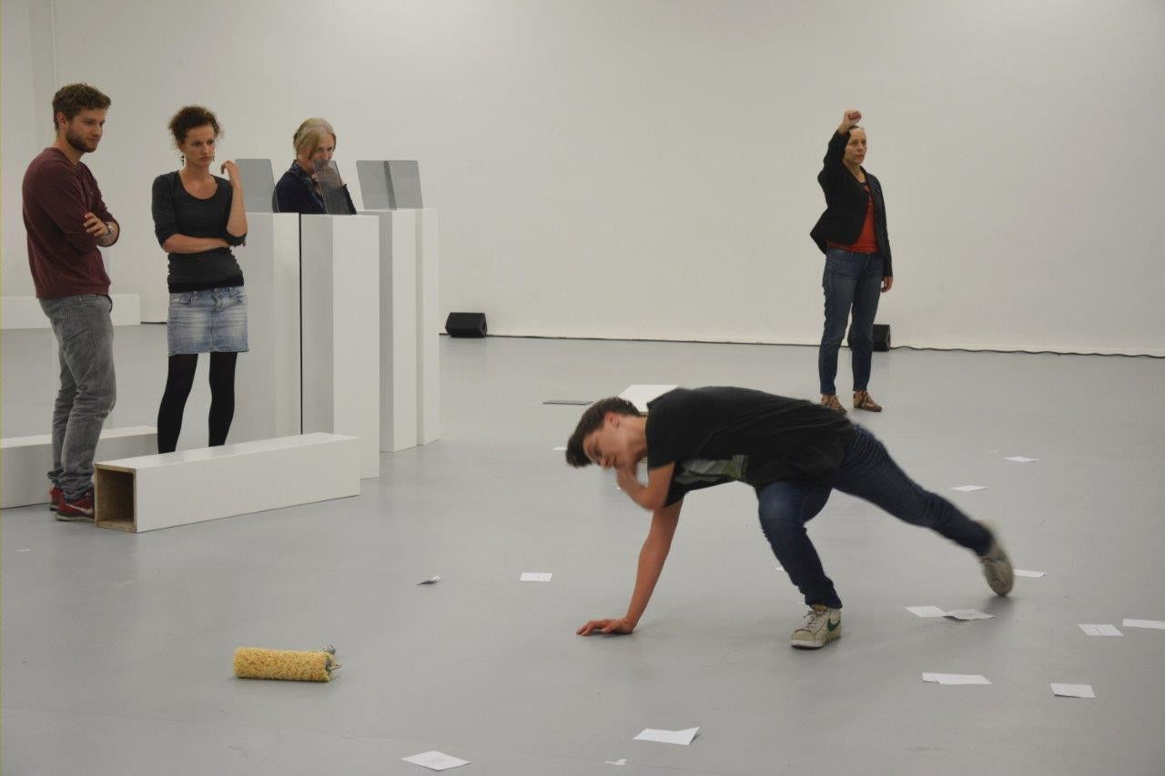 VERHALTET EUCH RUHIG / KEEP QUIET is a durational format on the boarder of visual art and choreography. Visitors can decide themselves when to come and to leave the space. The project subverts classical separations of spectators and performers and questions the possibilities of political change through insurrections as well as through an artictic medium: "The monument has to become revolution and the revolution has to become monument again." (Jacques Rancière)