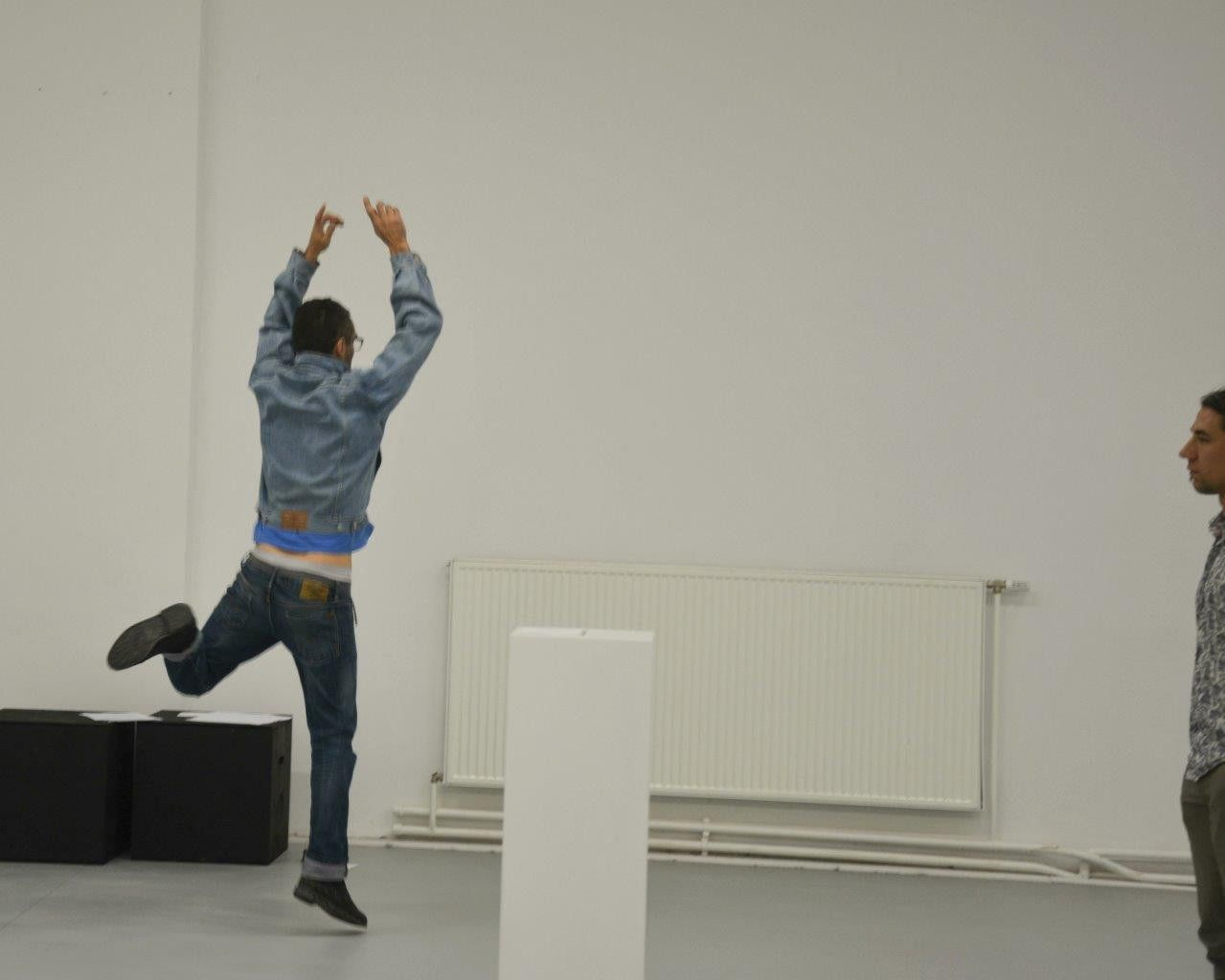 Die konzeptionelle Idee ist: Der Besucher betritt den Raum und hört eine Tonspur mit Geräuschen von Aufständen, die mit seinem eigenen Verhalten im Raum interagiert. So sind die Sirenen, Rufe, Trommelrhythmen am Lautesten, wenn sich kaum jemand im Raum aufhält. Hatte der Besucher beim Betreten die anderen Personen noch ebenfalls für Besucher gehalten, bilden einige von ihnen plötzlich eine Formation und durchqueren mit spurtenden Schritten und erhobenen Fäusten den Raum: Eine Aufstands-Choreographie, die gleichermaßen anstecken wie ins Leere laufen kann. Nach einiger Zeit unterbrechen die Ausführenden die Formation mehr und mehr, steigen aus, bleiben stehen und schweigen, so dass die konkrete soziale Interaktion zwischen den Anwesenden in den Mittelpunkt gerät. Zuschauer wie Performer werden in einen Zustand versetzt, der zwischen Aktivität/Mobilität einerseits und Unterlassen/Innehalten andererseits changiert. Alle Teilnehmer geraten unwillkürlich in ein Spannungsfeld zwischen realpolitischer Aktion und künstlerischer Formation.