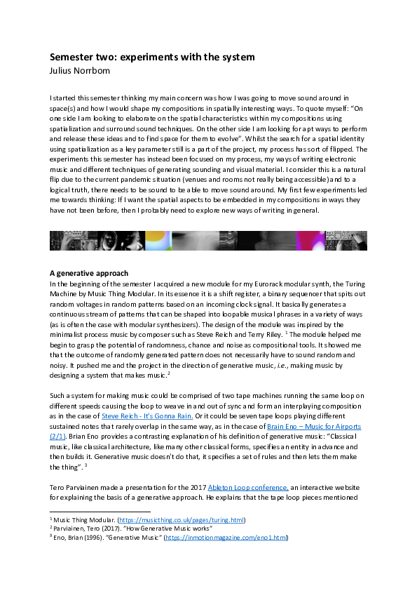 Hi everyone! In my project I am piecing together a generative audio-visual system. It is based on a modular synth setup in combination with the software Touchdesigner. The backbone of the system is clocked and controlled noise/randomness (both for visuals and audio). I use it to generate patterns that can be shaped, looped, and alter in different ways, or be left to flow as they arise.