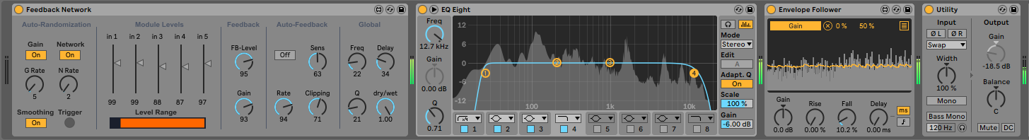 The device: Feedback Network consists of five Feedback Units, each of which has an independent bandpass filter and delay line. The output from each Feedback Unit can be routed to any of the other five, at an independent volume - Cycling74