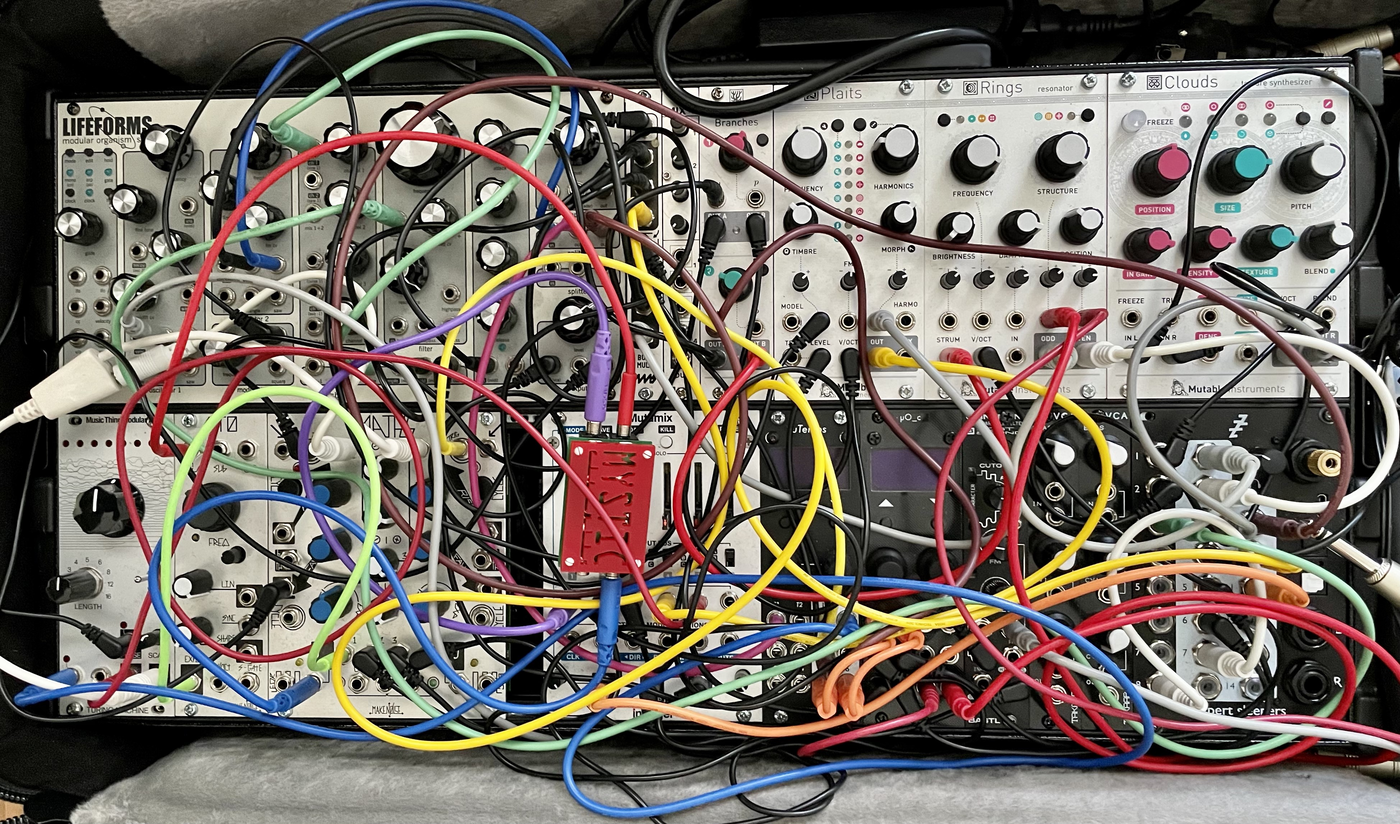 Without patch cables there is no score, no instrument, no performance, no system. Puech goes on to describe that a modular synthesizer fuctions as a closed world, an idealised, distilled ecosystem of communication in which each unit is musically void until it starts interacting with its peers [4]. What has helped me form a modular mindset is the fact that I am allowed to be as musically void as my peers, the actants in the network, the modules in the system. When physical and virtual connections between functions are made, new mental connections can emerge alongside a music I could not completly imagine or plan - a something else than the sum of the parts emerges.