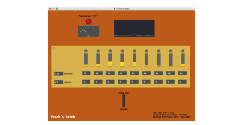 Prach’s Patch was designed following conversations with the composer Prach Boondiskulchok while we were at the Orpheus Institute, and is based on some of the ideas that we discussed. This patch works with selected predefined frequencies; these frequencies, up to 13, were chosen from a harmonic series or from other types of pitches, according to our predefined options. These frequencies were obtained through subtractive synthesis applied to a wide-range cluster recorded at the fortepiano. Subtractive synthesis was applied through two filters: bandpass and resonator. As with Octavia’s Threads, this patch can be controlled by a musician-collaborator or by the performer at the fortepiano.