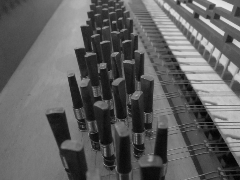 John Cage’s In a Landscape proved particularly interesting to work on; composed for piano or harp, its aptness for the fortepiano is also remarkable. Cage’s Sonatas and Interludes were on our mind while trying out specific effects; we could thus avoid inserting physical objects to ‘prepare’ the fortepiano.