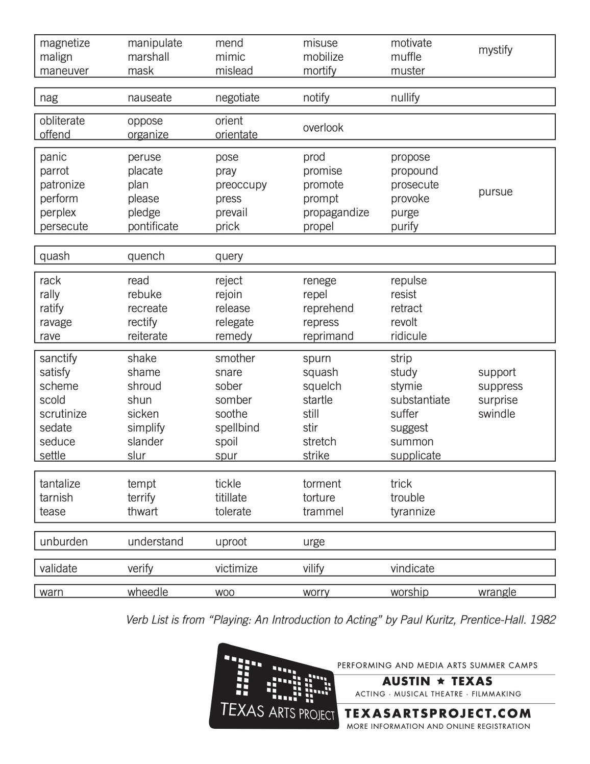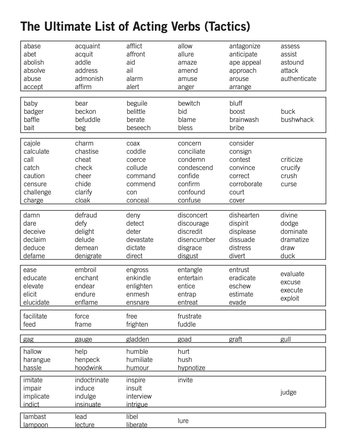 After having gone through the scene finding a scenic objective and an objective for every beat it is time to look at every line of dialogue. How do I want the line to hit the other person that I am talking to? Here we have a list of acting verbs, that are active verbs describing how we want the action to land on the other person. This list can be viewed as tactics on how to get what you want from the other person in the scene. There are many ways of saying a line, by using this method I connect the delivery of the line to the objective, thereby using the objective to fuel your acting in trying to persuade the other character to give me what I want. The actions are something I tend to play around with a lot in rehearsals, trying out different actions and seeing how that affects the other actor in the scene. I go for the juicier choices here as well. In working this way, I may find new ways of performing the script and experience new meanings in the text, which is a fun experience and makes the performance more unique.