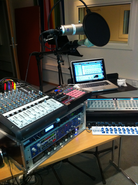 This is an overview of my present setup. (A larger version will be found in the appendix.) As shown in the figure, the microphone signal is split and sent both to the mixer and to the audio interface. In the centre is the Mackie Onyx 1220 mixer, which receives input from all of the connected devices. Then, clockwise from the upper right: