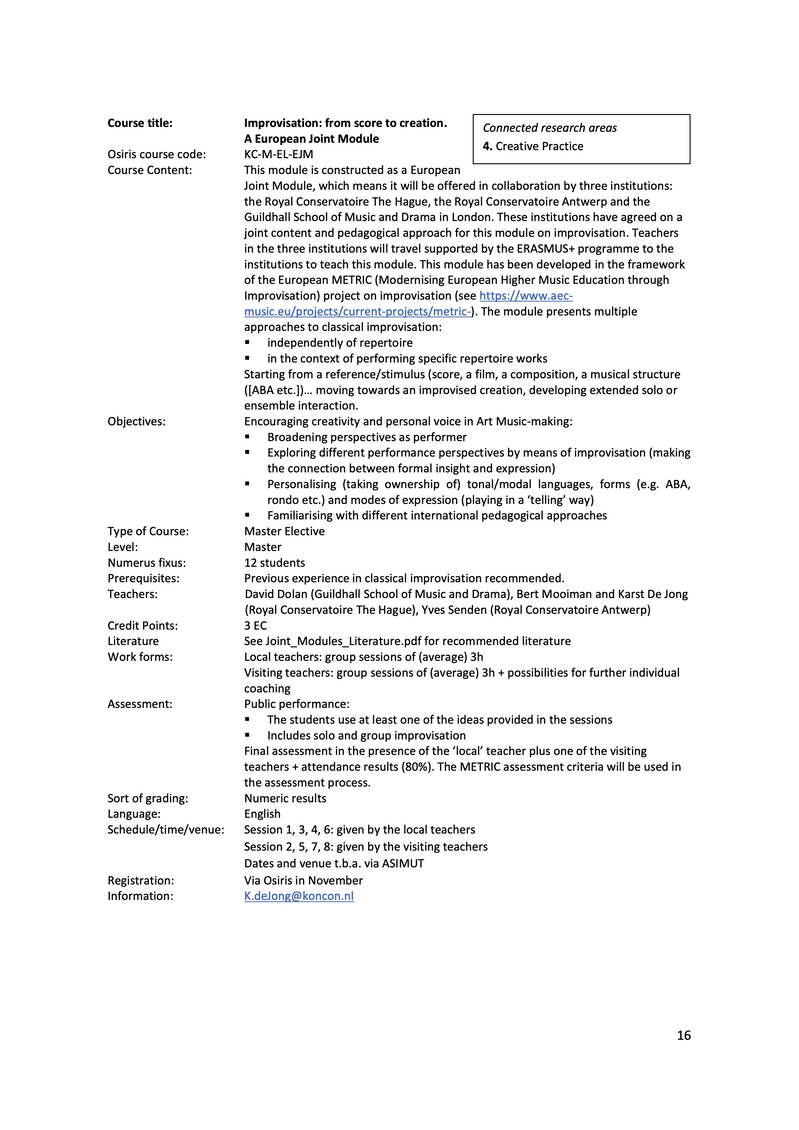As the subtitle of the course From Score to Creation indicates, during the classes we have taken various pieces from the literature as starting points for exercises in improvisation. This was not done to make them improvise new versions of the repertoire, but rather to give them certain starting points to create their own improvisations. As the course description states, this should achieve various objectives: broaden their perspective as a performer, exploring performance perspectives by means of improvisation, and acquiring ownership of tonal/modal languages, forms and modes of expression. The coaches can take very different and personal approaches to achieve these objectives, and the students can select what works for them.