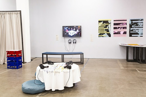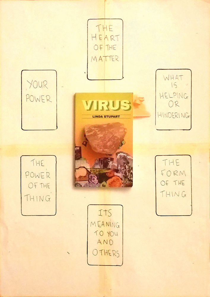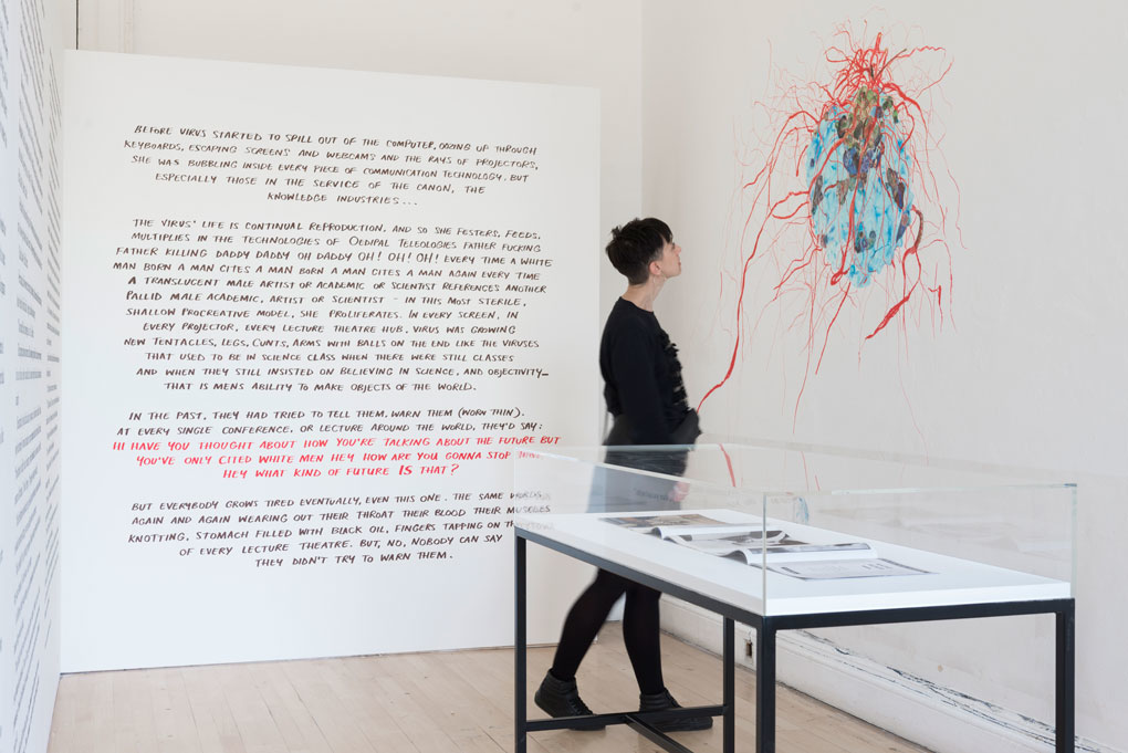 The exhibition consisted of sculptural elements; three videos; two performances; and a series of prints of spells written for/against the artworld. Virus synthesises four years of performative and more traditional research – engaging with a range of contemporary artists, institutions, and writing practices to reformulate the possibilities for art criticism and institutional critique within artworlds. This practice-based research offers new possibilities for embodied art criticism.