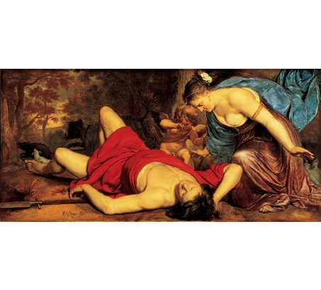 Levenloos ligt de minnaar van de Romeinse godin van de liefde op de grond. Adonis is wreed doorboord door een wild zwijn dat Mars uit jaloezie achter hem aanstuurde. Mars is namelijk de eigenlijke geliefde van Venus. Amor (beter bekend als Cupido) staat Venus bij in haar verdriet.