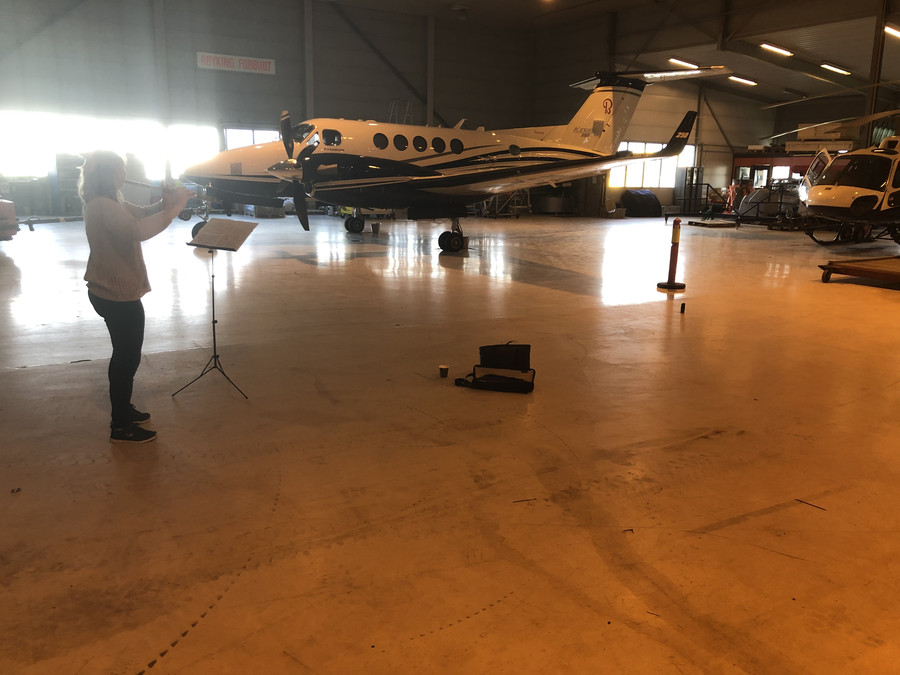 Fjerde opptak ble gjort i den største av Helitrans’ hangarer på Værnes. Hangaren er ca. 1100m2 med takhøyde på ca. 10m, og det stod flere fly og helikopter inne. Mic gain står fortsatt på 4, og det er ca. 4 meter mellom meg og opptakeren. Opptaket ble gjort på en vanlig hverdag, og det var derfor flere som jobbet og pratet i rommet mens jeg spilte inn. Det var også folk på jobb i kontorlokalene rundt som kom for å høre på. Fløytemusikk er ikke en del av deres normale arbeidsdag, så flere gjorde filmopptak underveis. Jeg fikk også mange hyggelige kommentarer og ønsker om å komme tilbake og gjøre flere opptak. Her er utdrag fra 4. sats - Fjell-lengt:
