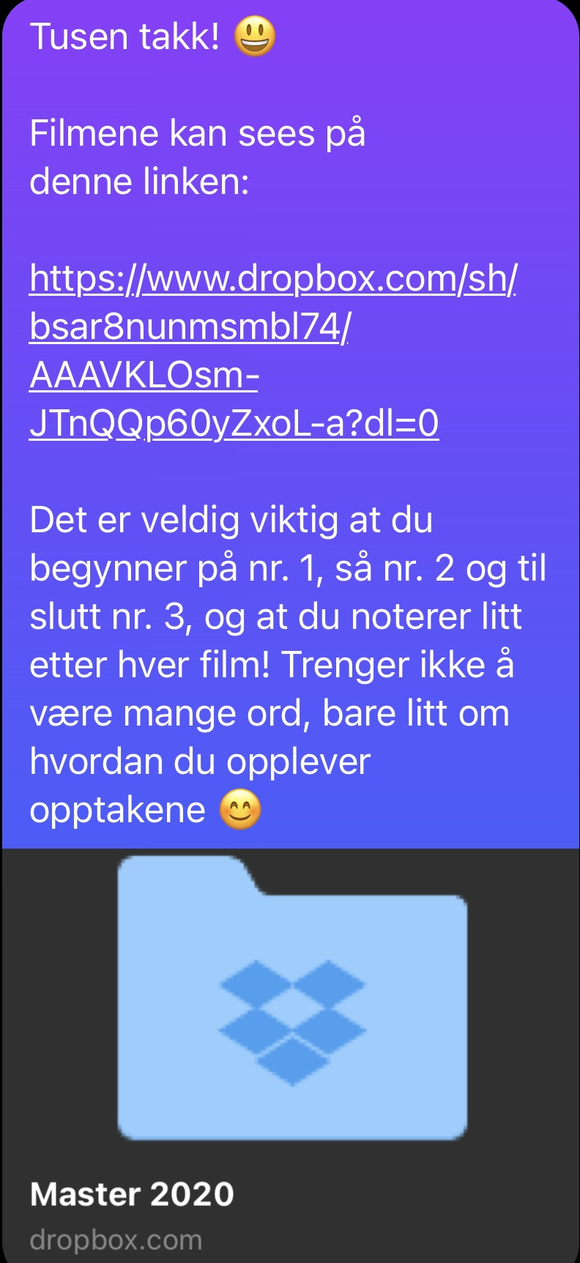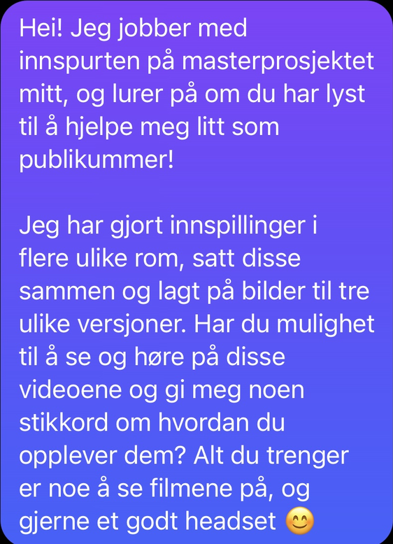 Da jeg bestemte meg for å dele arbeidet mitt med et publikum bestemte jeg meg også for at jeg ønsket å få høre om deres opplevelse av produktet. Det var viktig for meg å ikke lage for mye arbeid for publikum, da jeg var redd for at en forventning om utfyllende tilbakemeldinger kunne skremme lyttere vekk heller enn å få dem engasjert. Jeg ønsket også å gjøre kommunikasjonen med publikum enkel og personlig. Derfor skrev jeg disse to meldingene som jeg sendte på Messenger til 30 venner og bekjente, med en lenke til filene i DropBox: