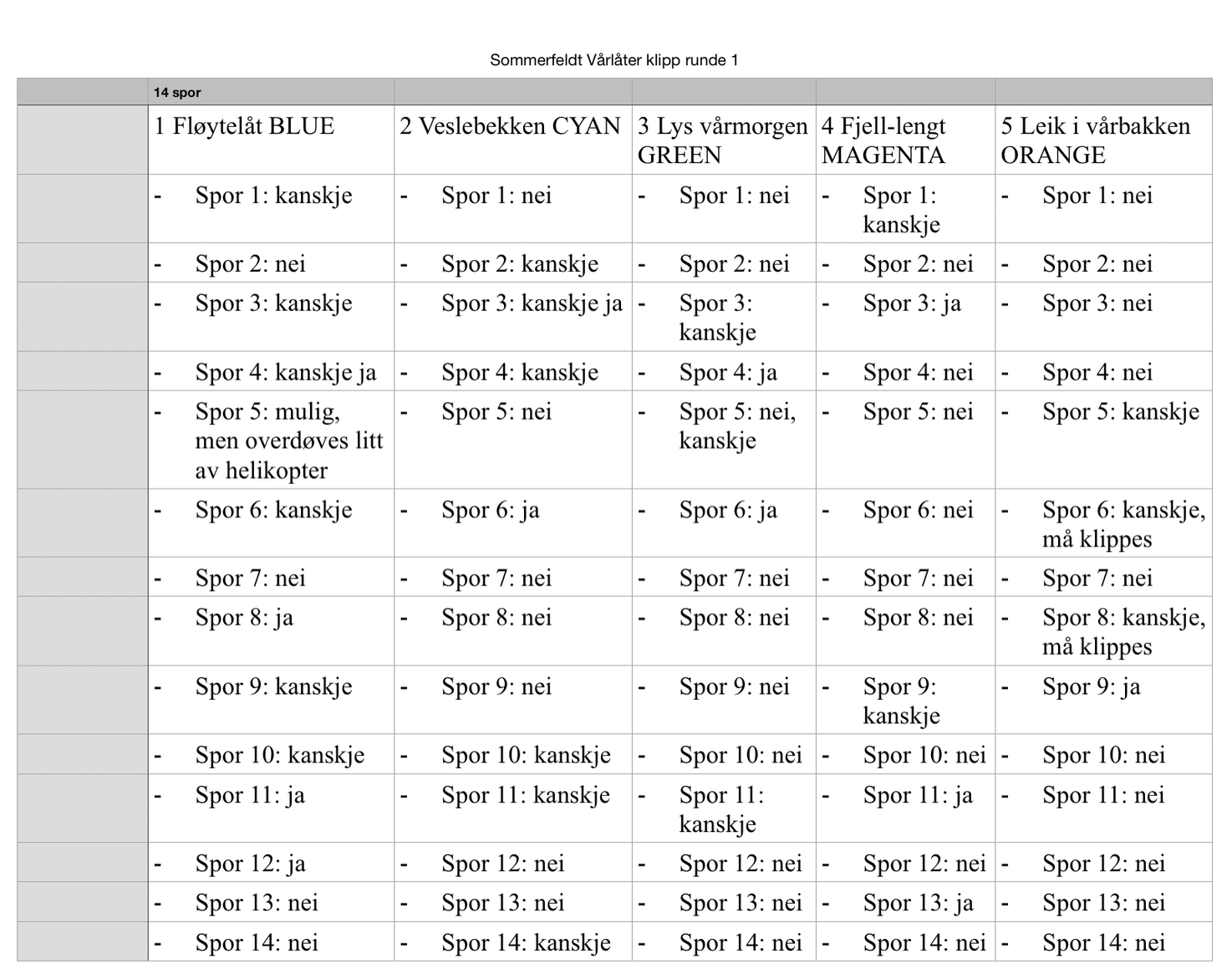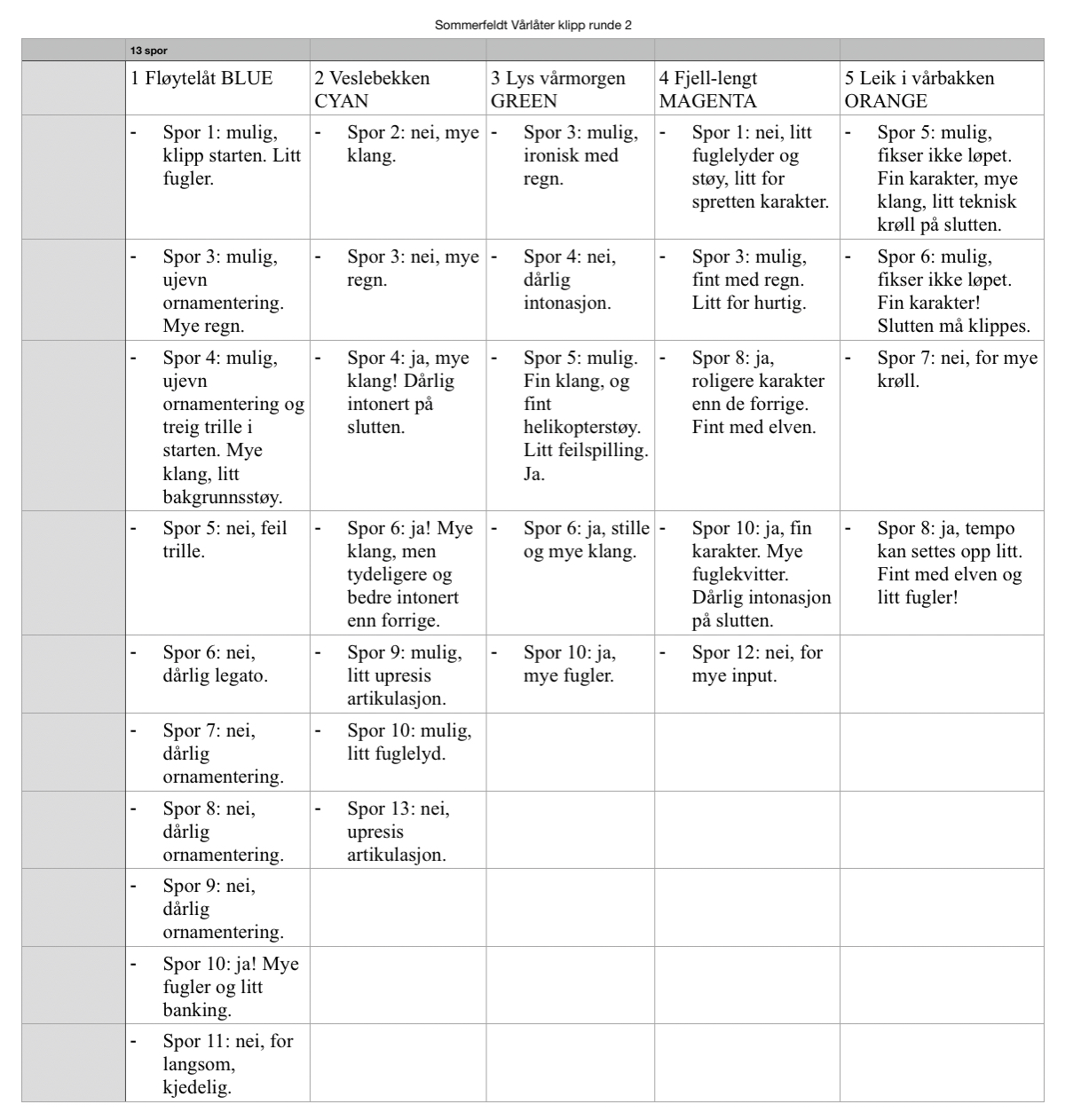 Når jeg nå hadde fjernet en god del opptak som ikke kunne brukes startet jeg prosessen på nytt med ny oversikt over nåværende opptak. Denne gangen ville jeg notere mer på de satsene jeg kunne tenke meg å bruke, slik at det ble lettere å velge ut de endelige opptakene til slutt. Etter denne runden med lytting så skjemaet slik ut: