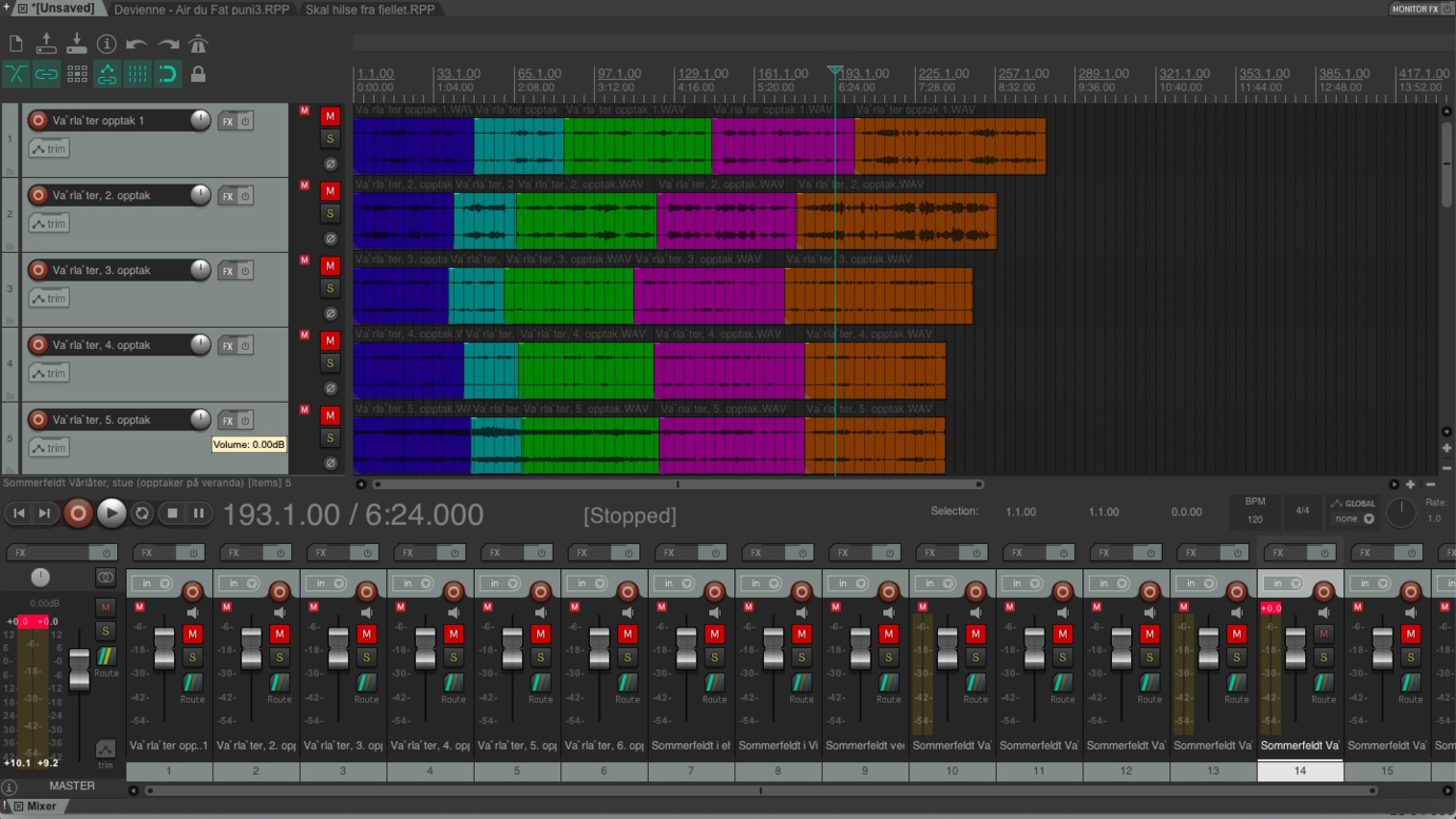 Da de opptakene som ikke skulle være med videre var slettet fra prosjektet så arbeidet i Reaper slik ut:
