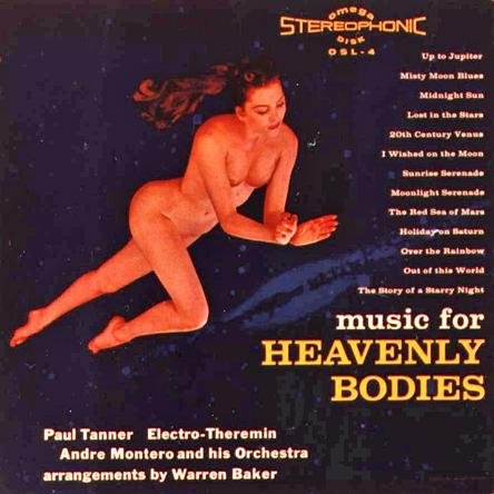 The Theremin featured prominently in these space-age pop albums, such as Harry Ravel’s Music out of the Moon (1947), conducted by Les Baxter (the first ever LP with a color cover – see Figure 1). Taylor (Taylor 2001: 84) suggests that the eerie wailing sound of the Theremin, representing the sounds of space, contrasts with the sound of the earthbound human orchestra, which eventually conquers and dominates the sound of the aetherial and seductive space sirens. The Theremin is used on another album from this era Music for Heavenly Bodies (1958) which also displays a scantily clad woman (presumably another heavenly body) above the Milky Way (Figure 2). The liner notes describe the Theremin’s ability to convey the “awe-inspiring feelings of asteroids and comets” (Taylor 2001: 91). [12]